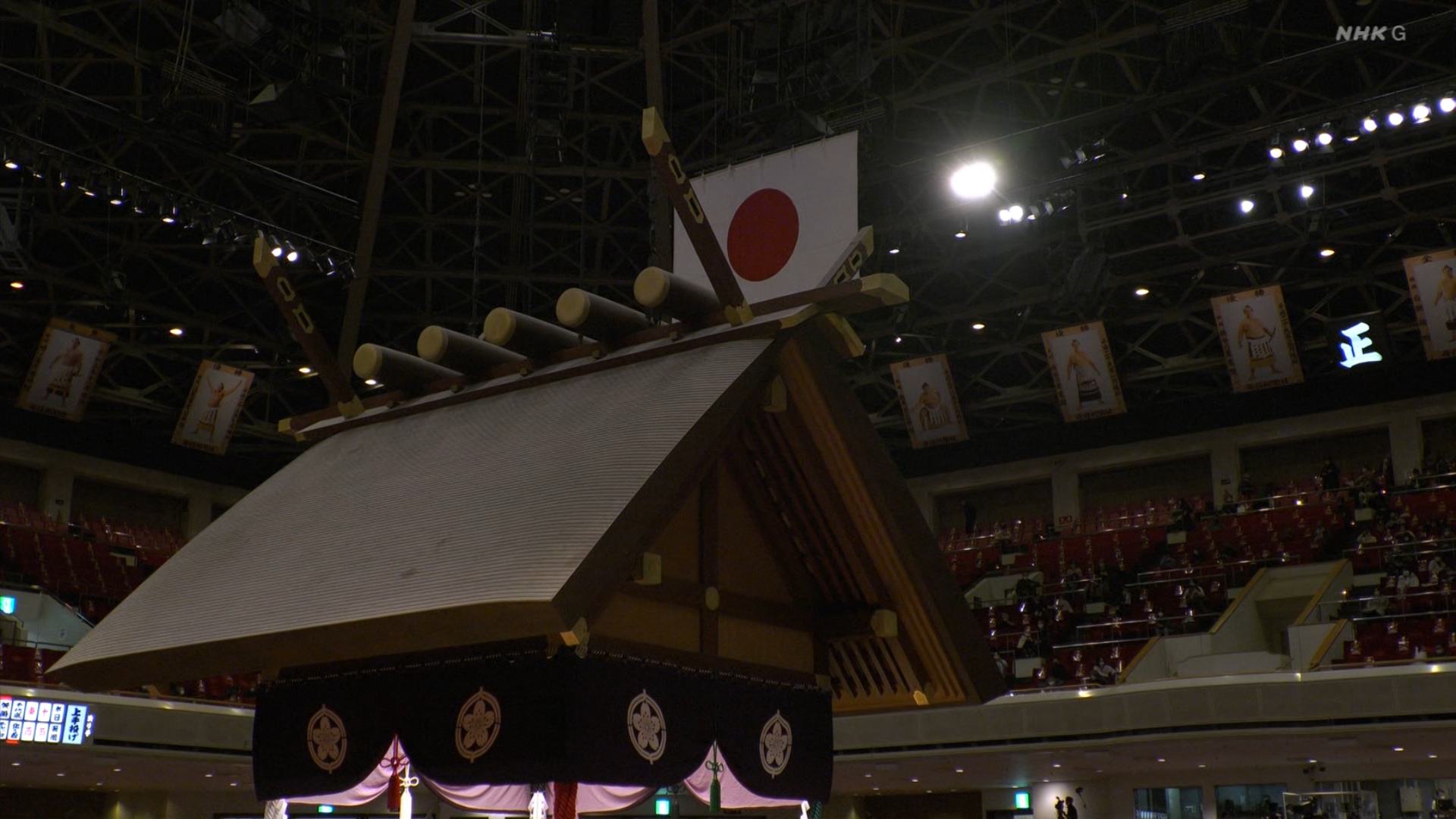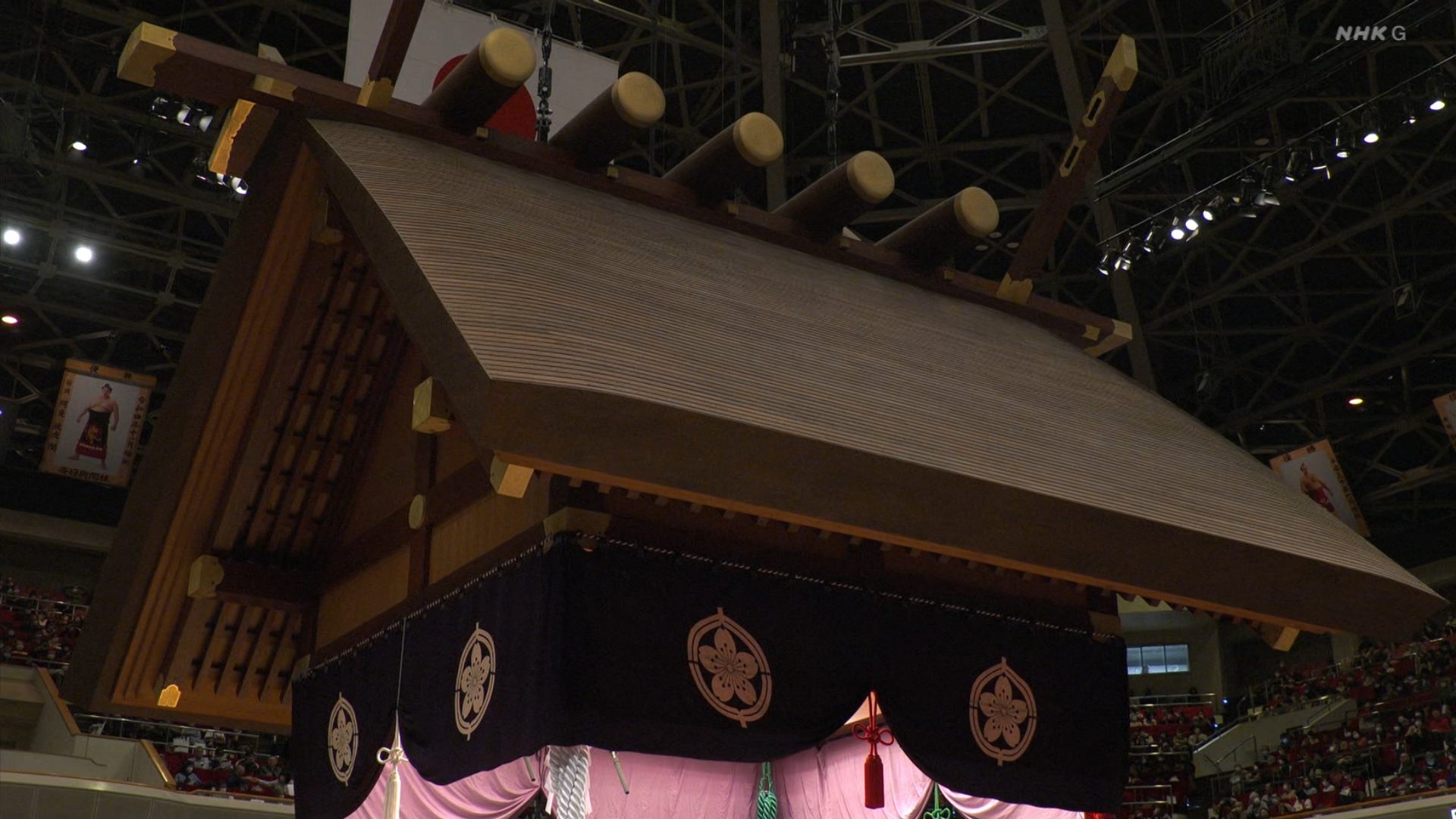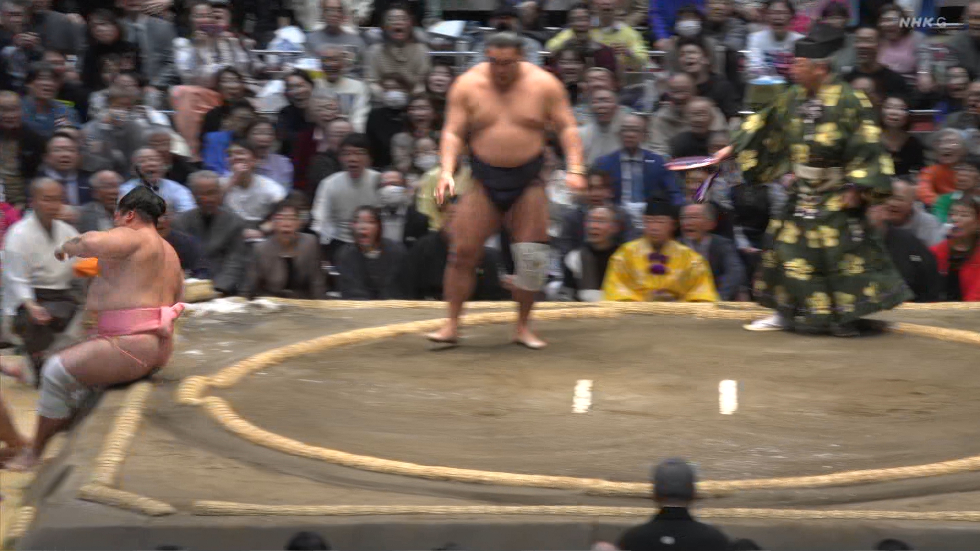 【解説】正面 琴風 浩一〔元大関〕、向正面 大嶽親方〔元 大竜関〕