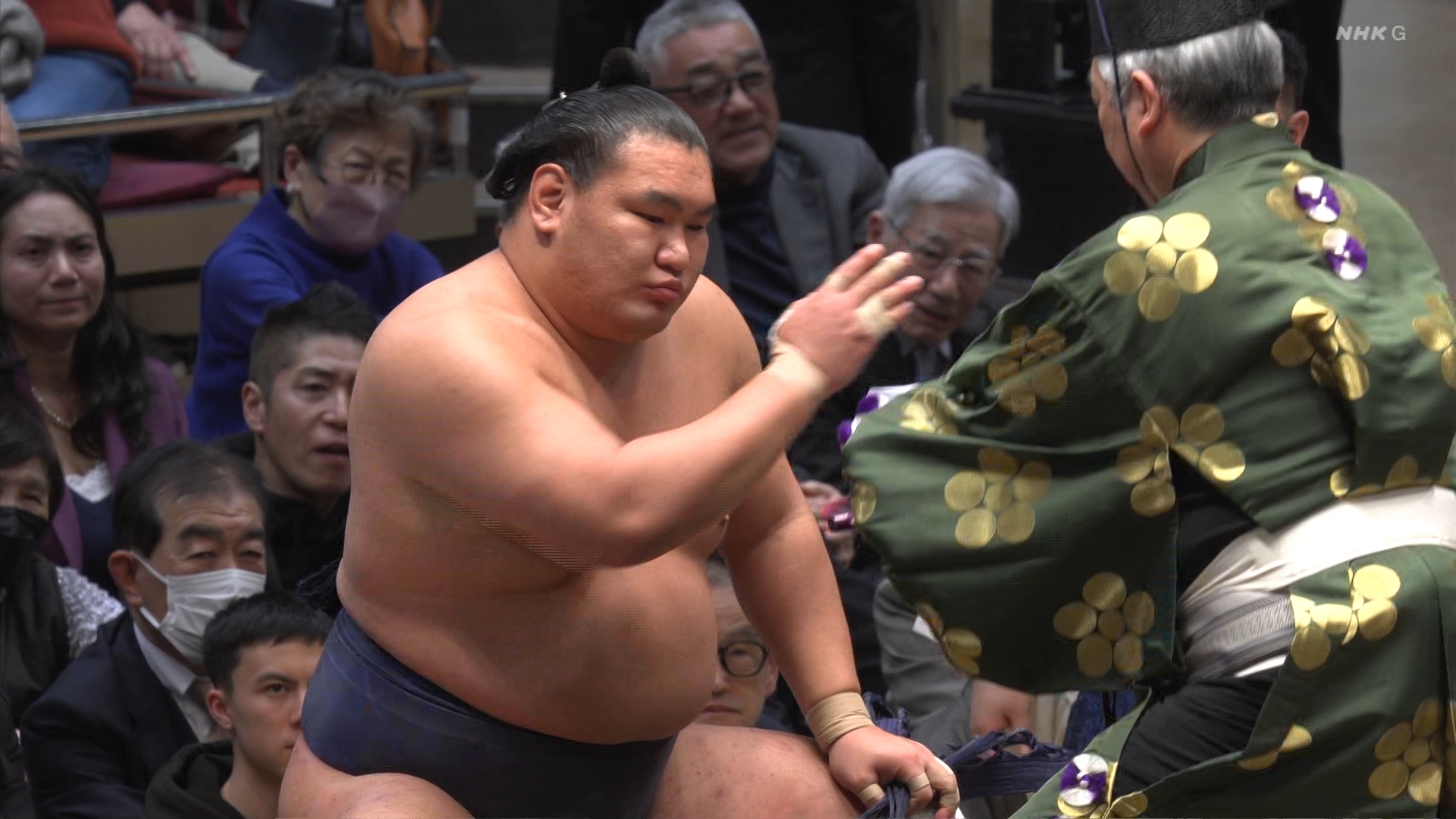 【解説】正面 荒汐親方〔元 蒼国来関〕、向正面 若者頭 琴裕将〔元 琴裕将関〕