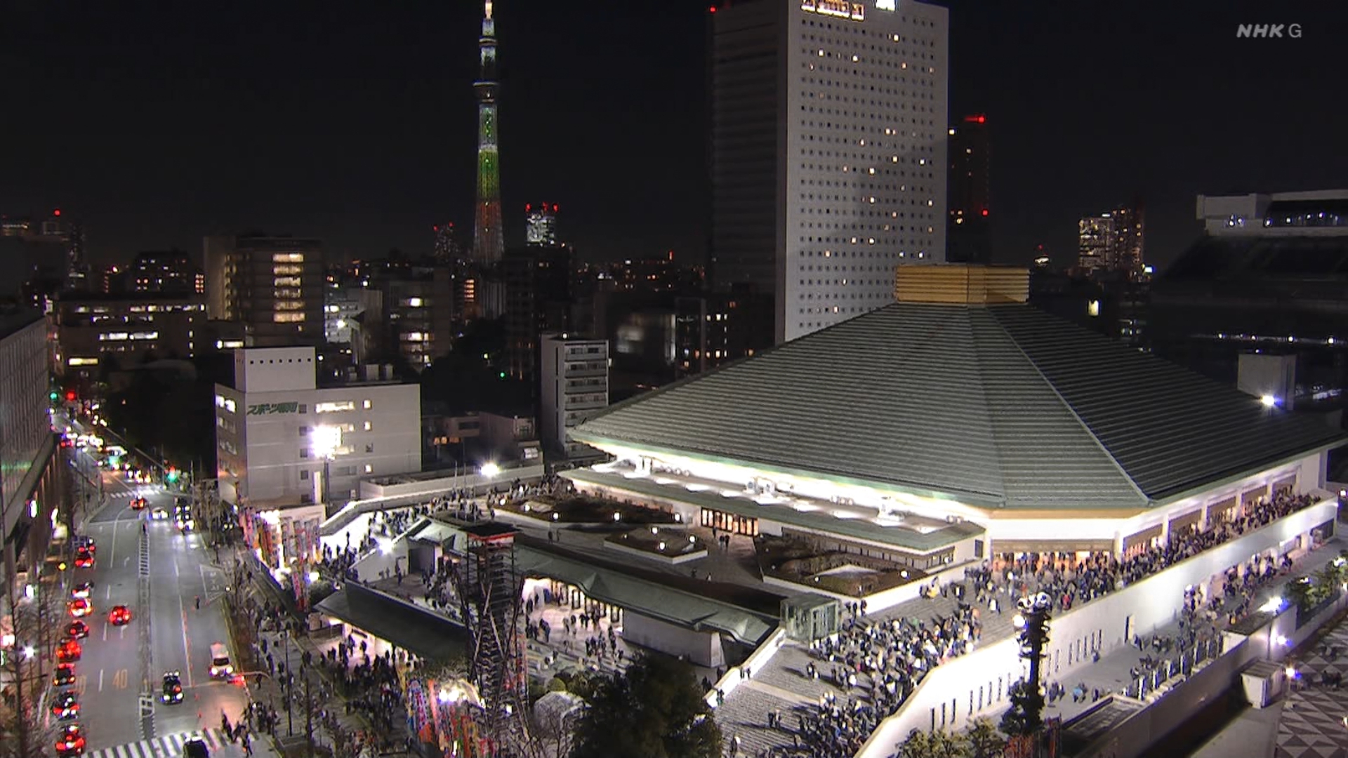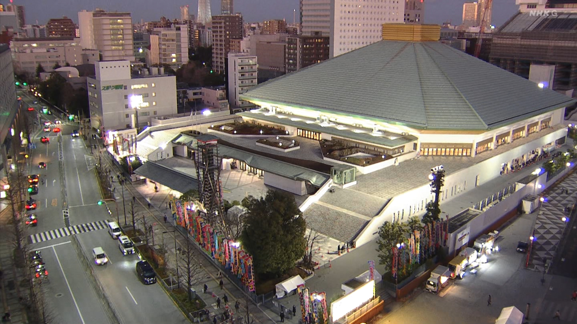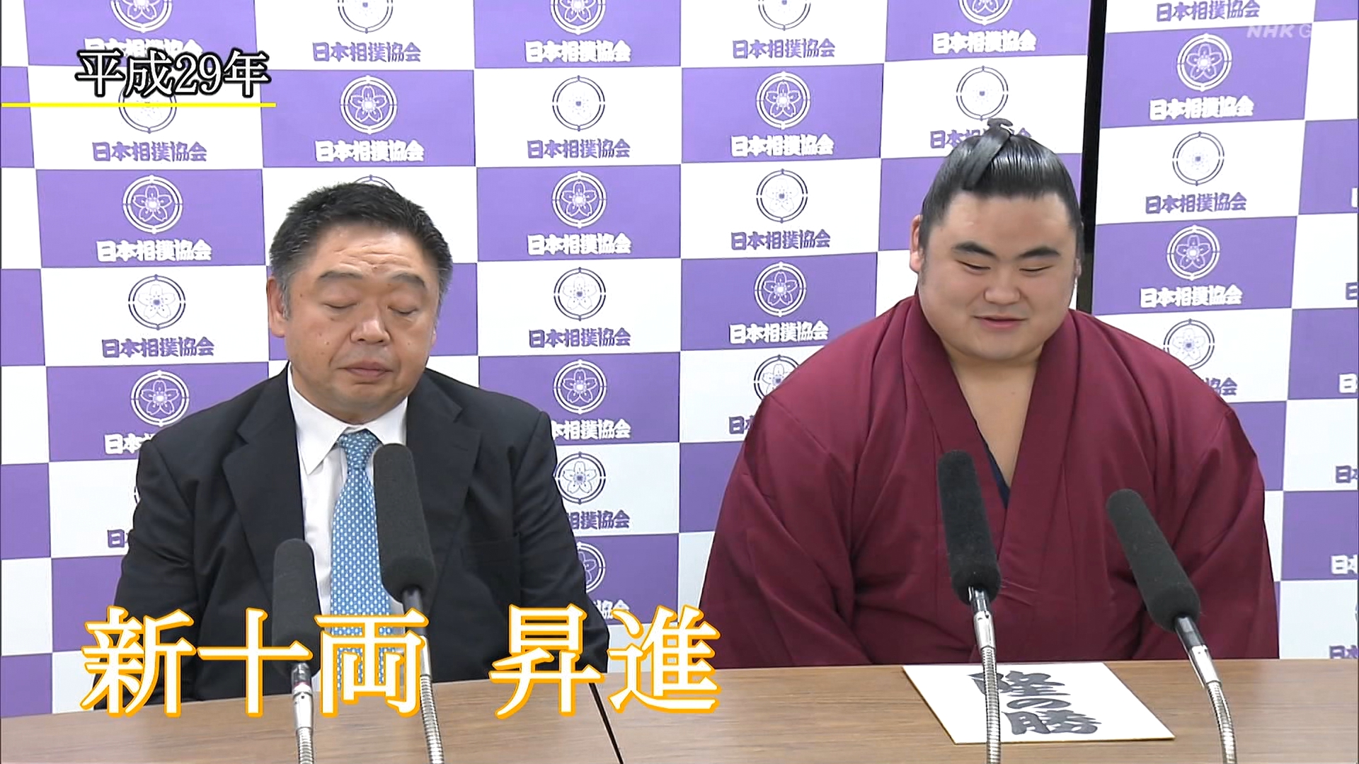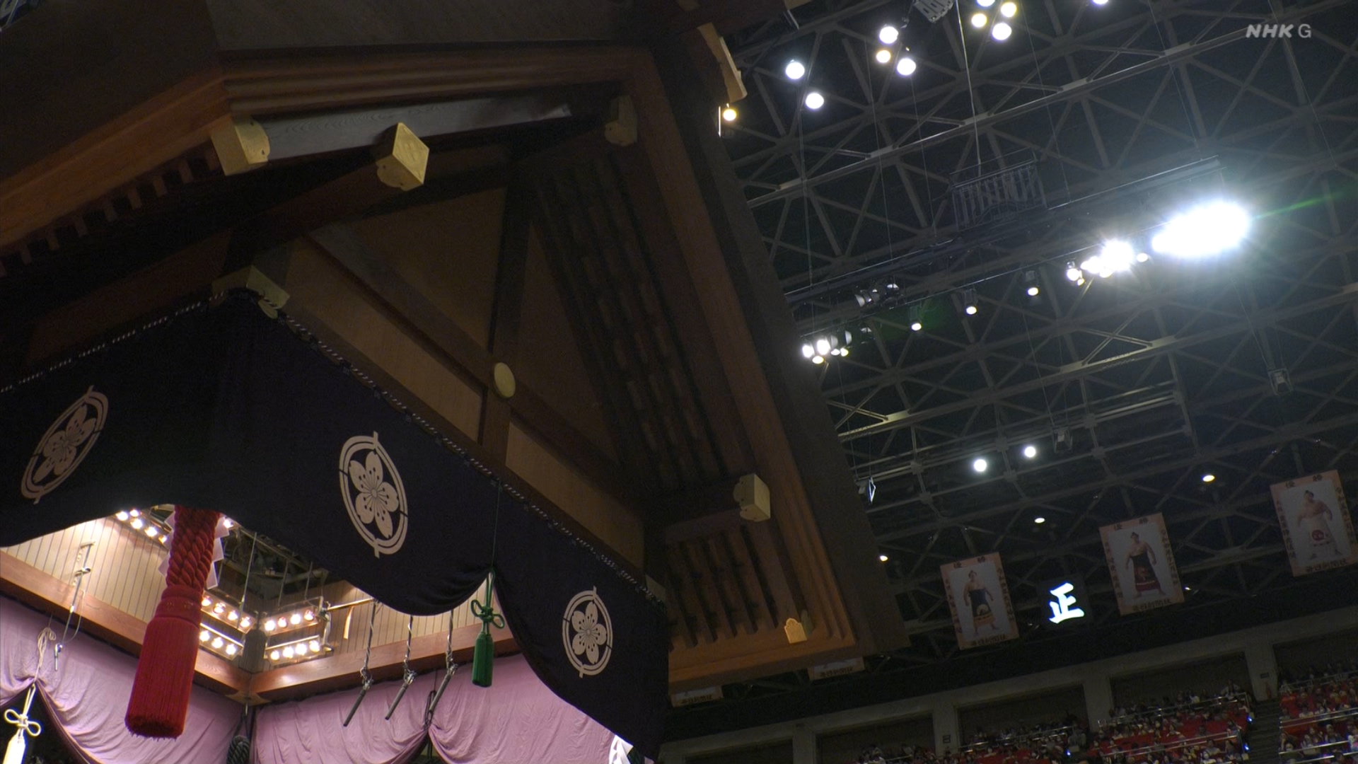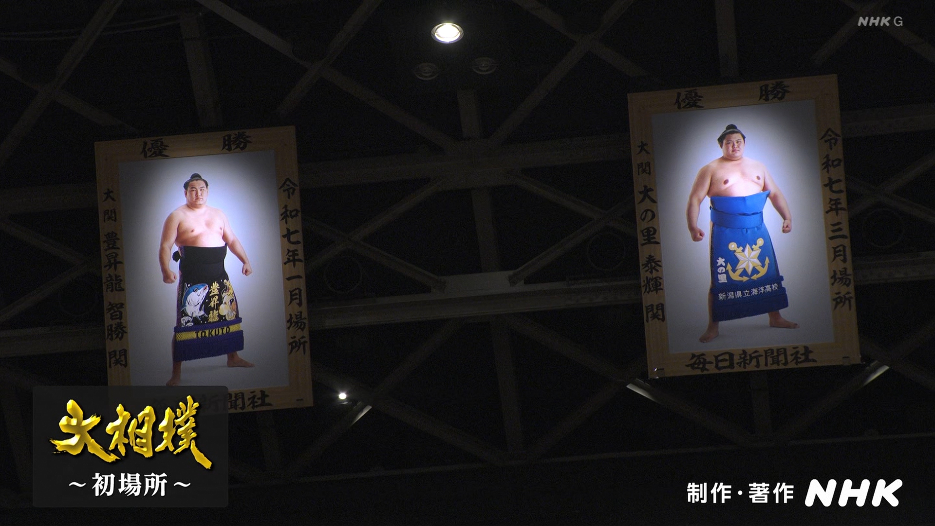 【解説】正面 伊勢ヶ濱親方〔元横綱 照ノ富士関〕、向正面 振分親方〔元関脇 妙義龍関〕