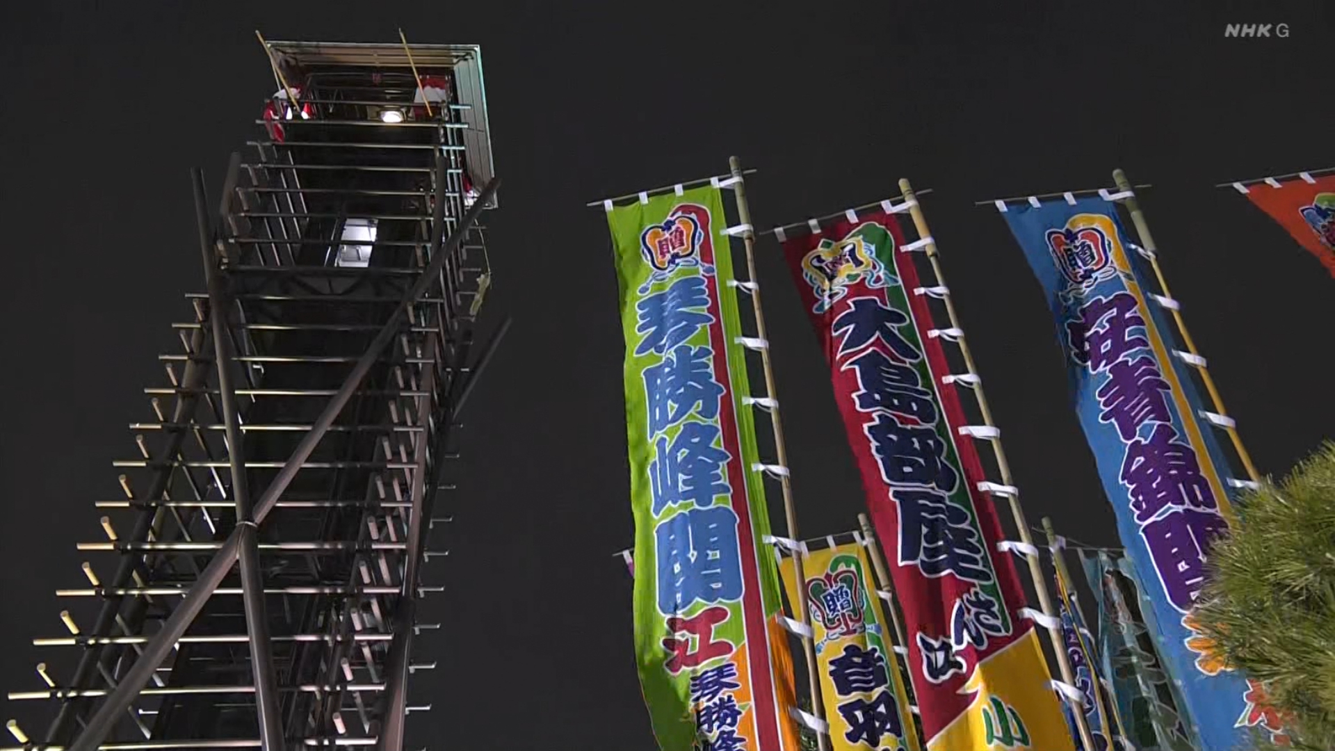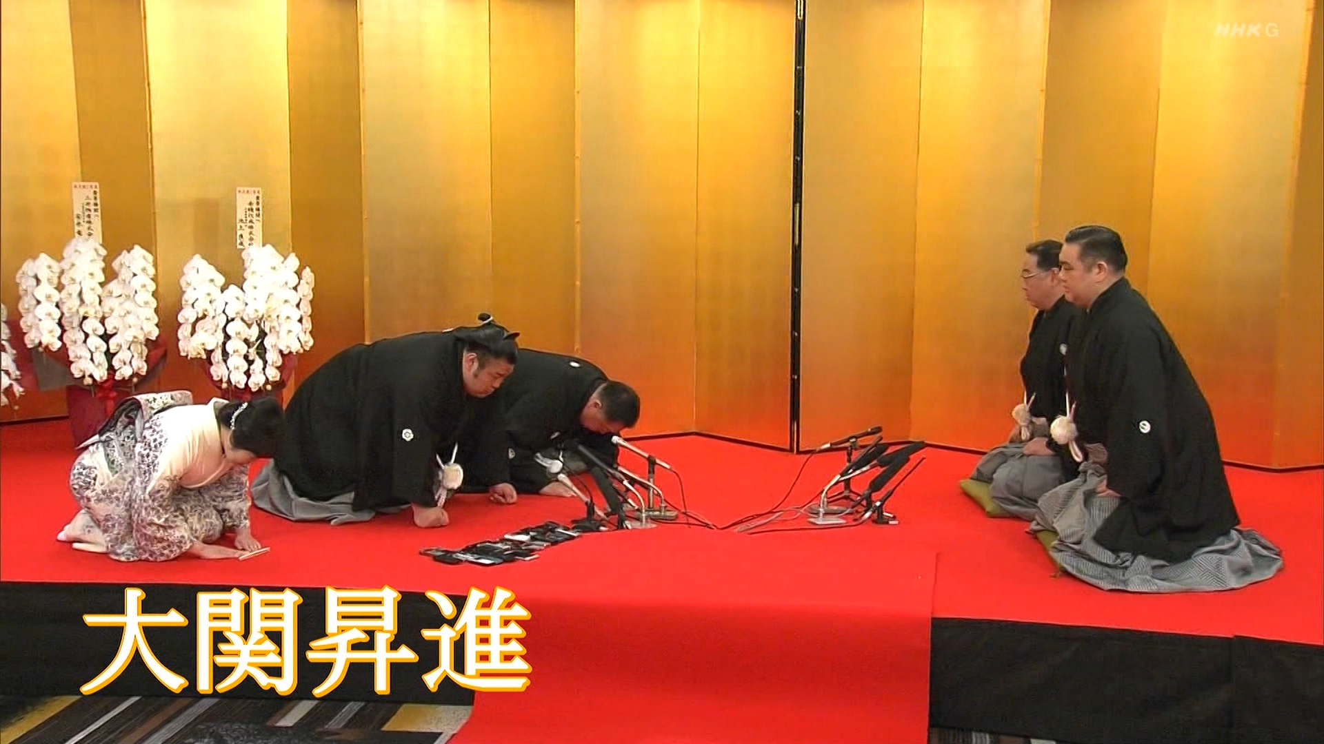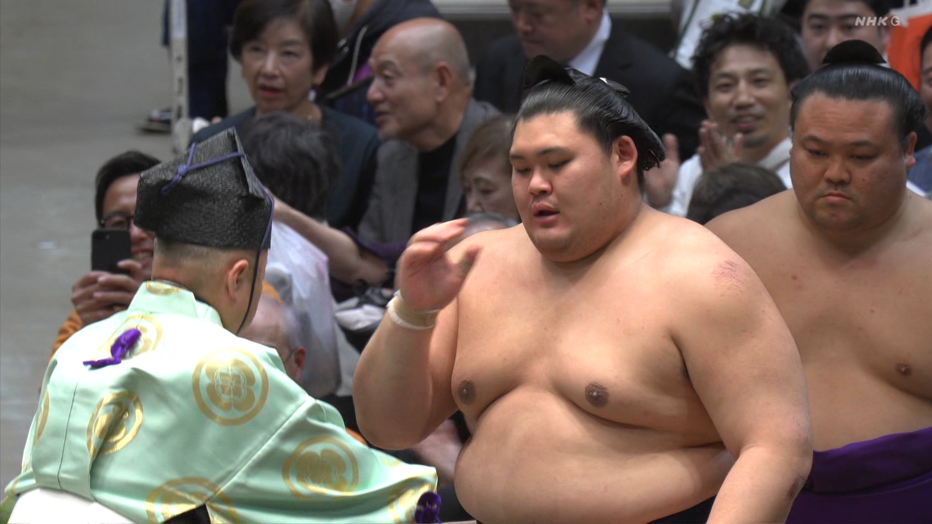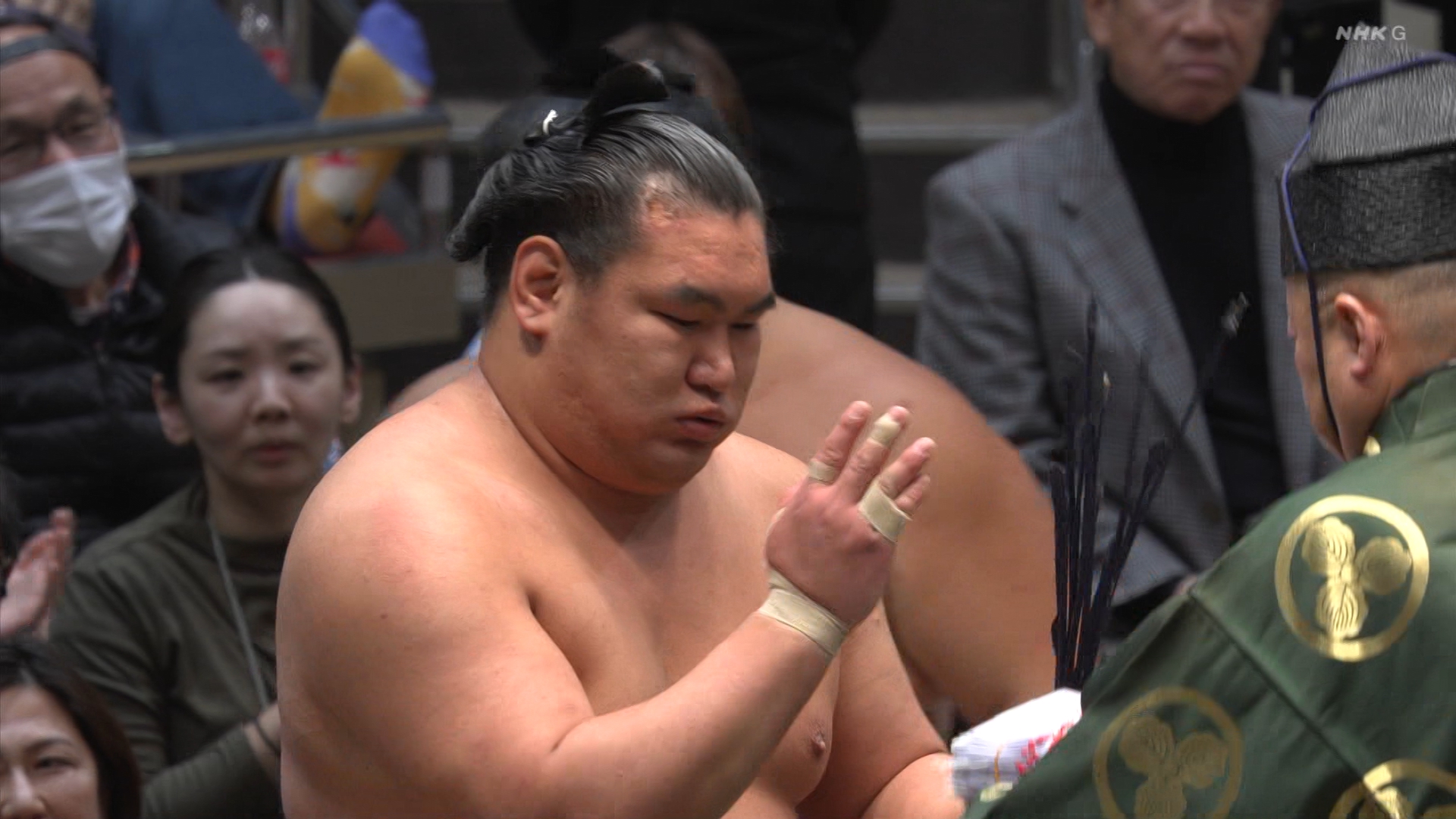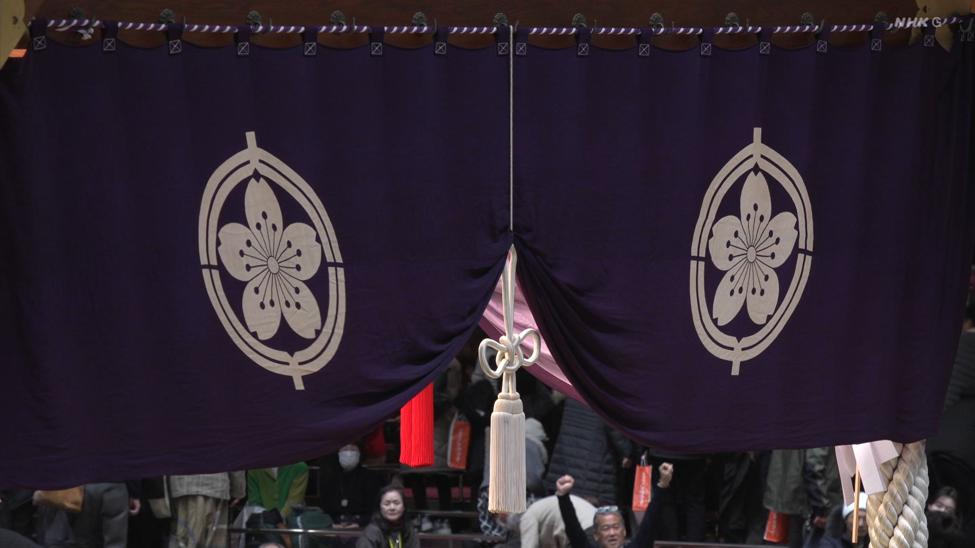 【解説】正面 尾車親方〔元 琴恵光関〕、向正面 若者頭 虎伏山〔元 虎伏山〕