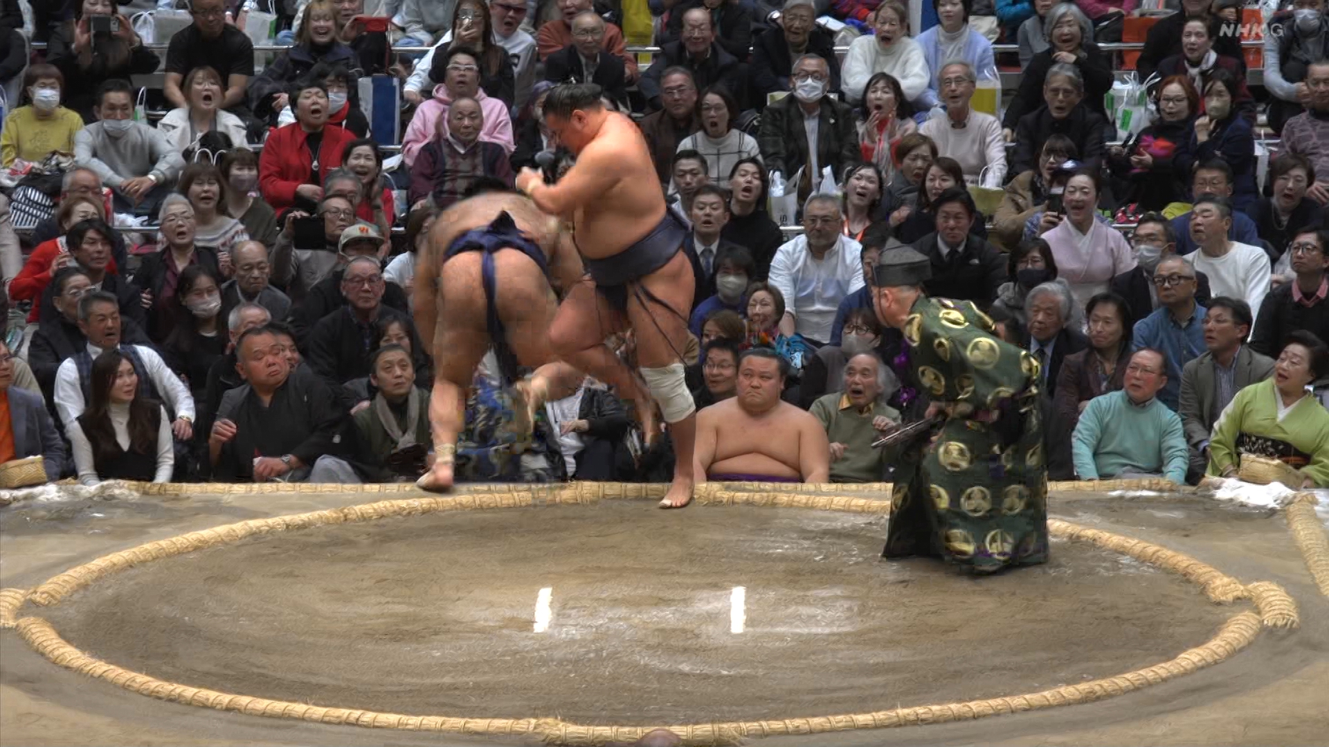 【解説】正面 琴風 浩一〔元大関〕、向正面 岩友親方〔元関脇 碧山関〕