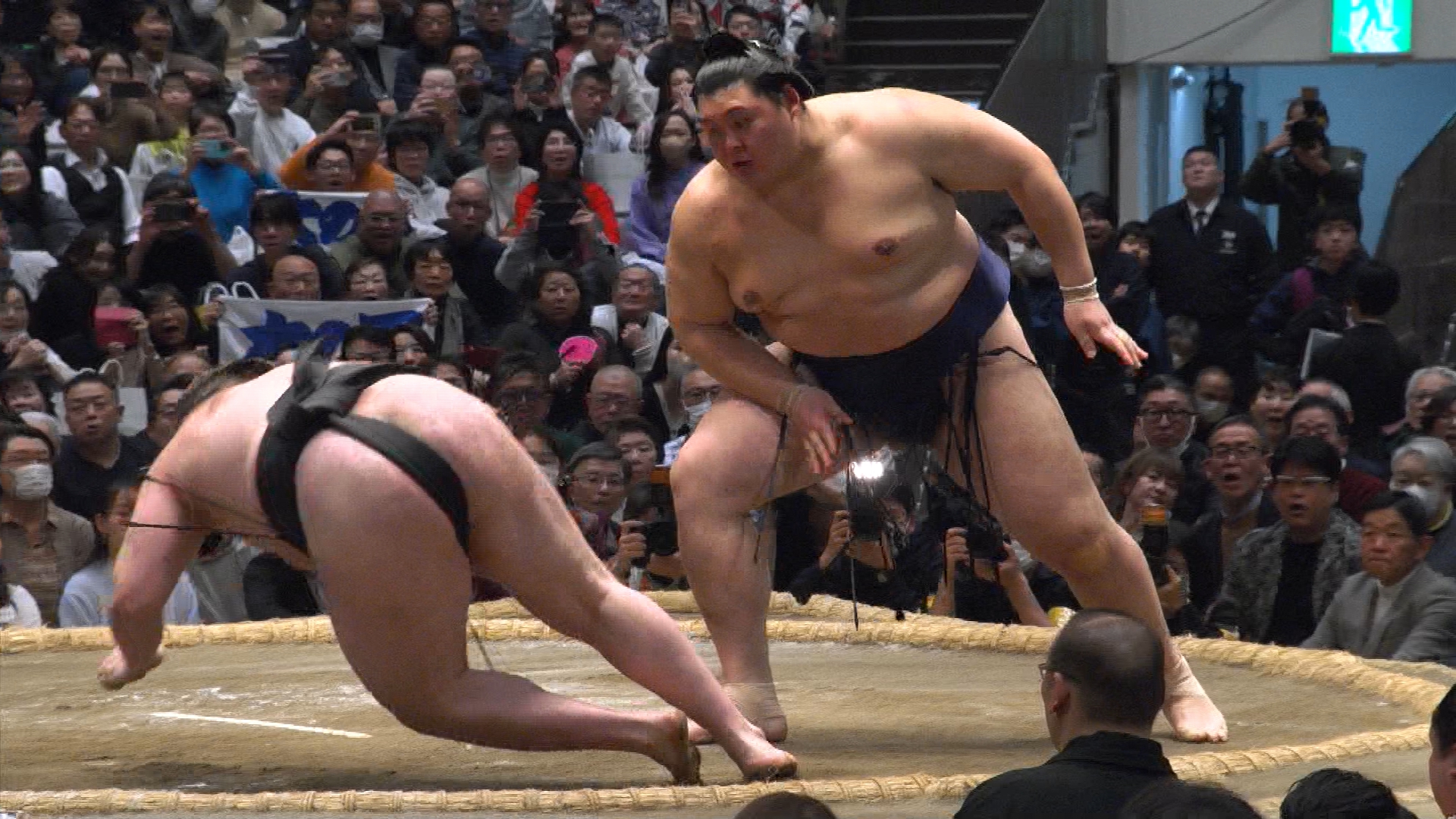 【解説】正面 伊勢ヶ濱親方〔元横綱 照ノ富士関〕、向正面 振分親方〔元関脇 妙義龍関〕
