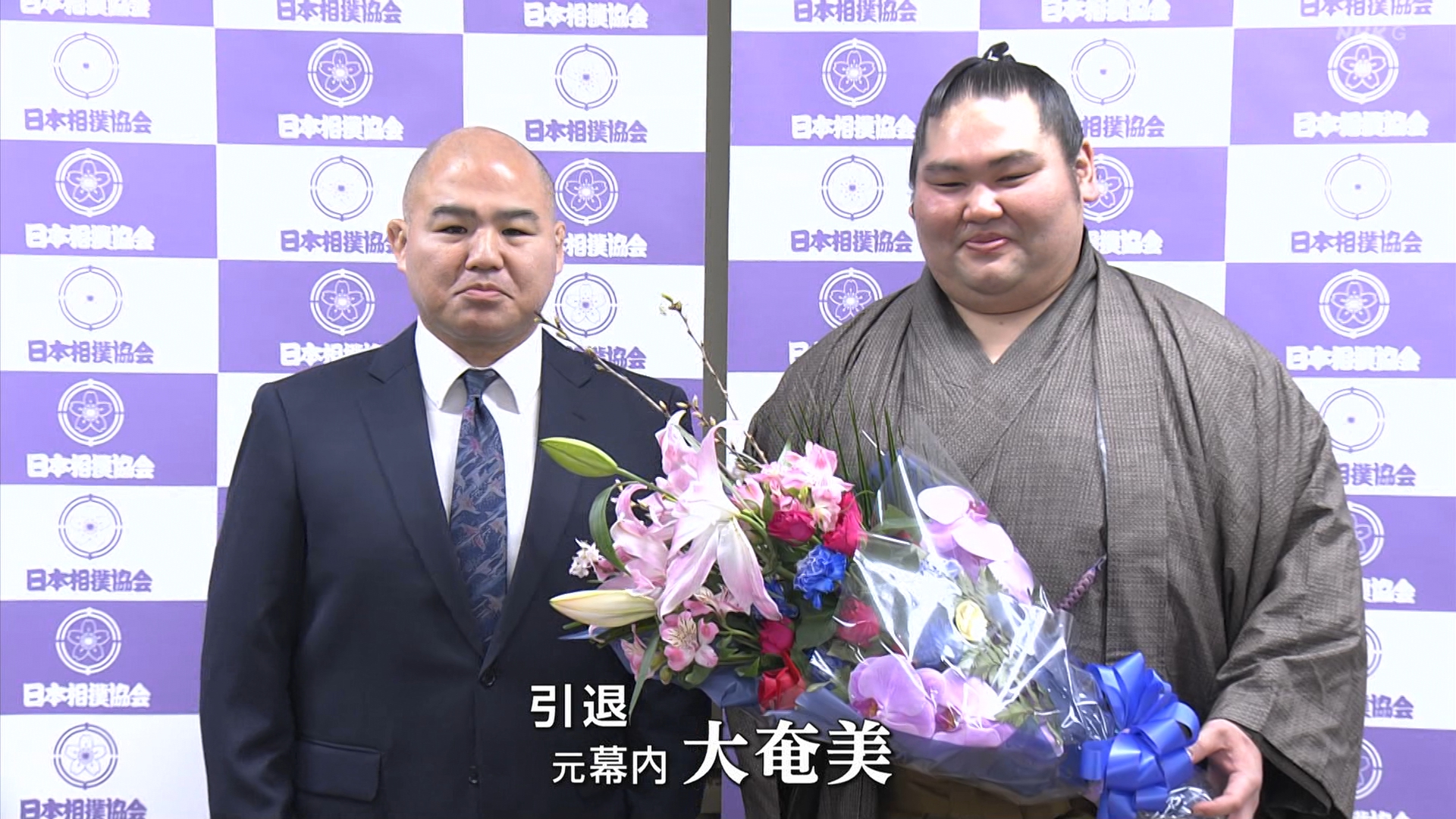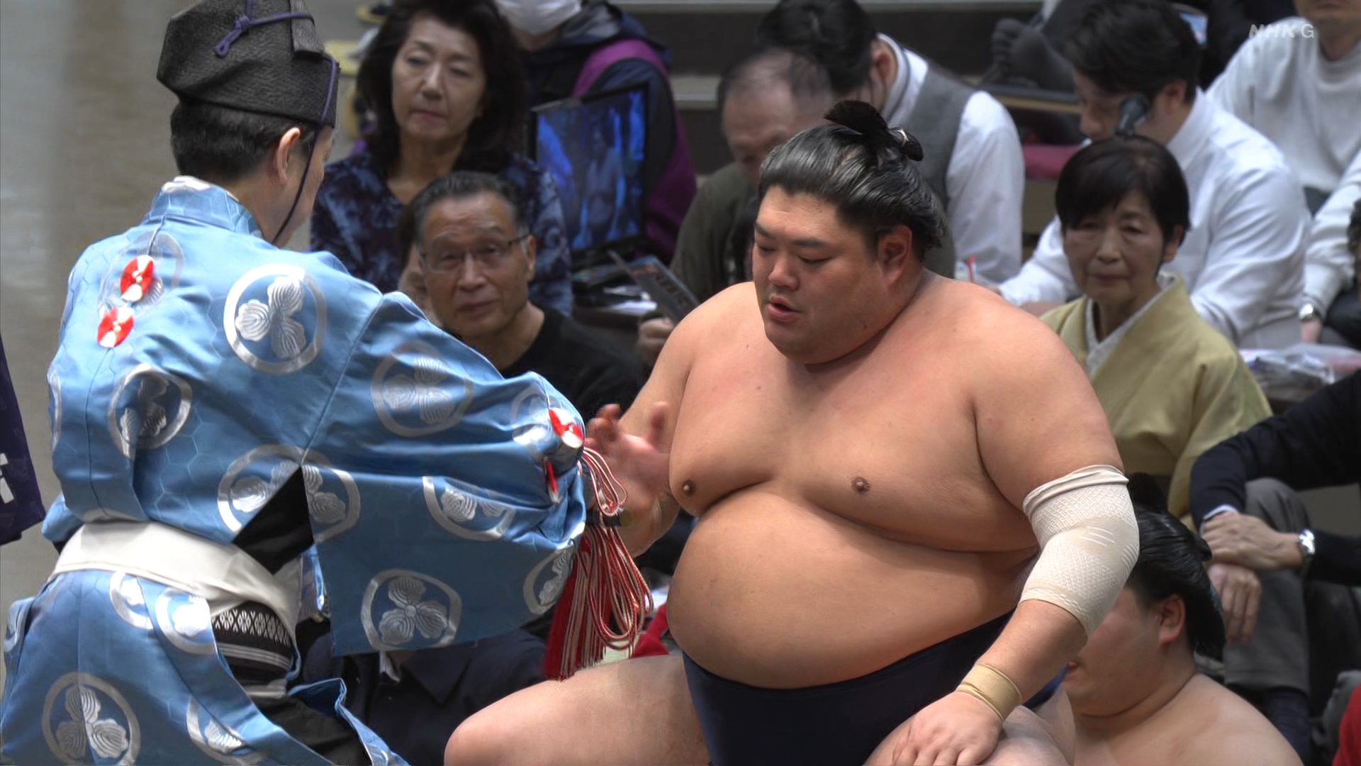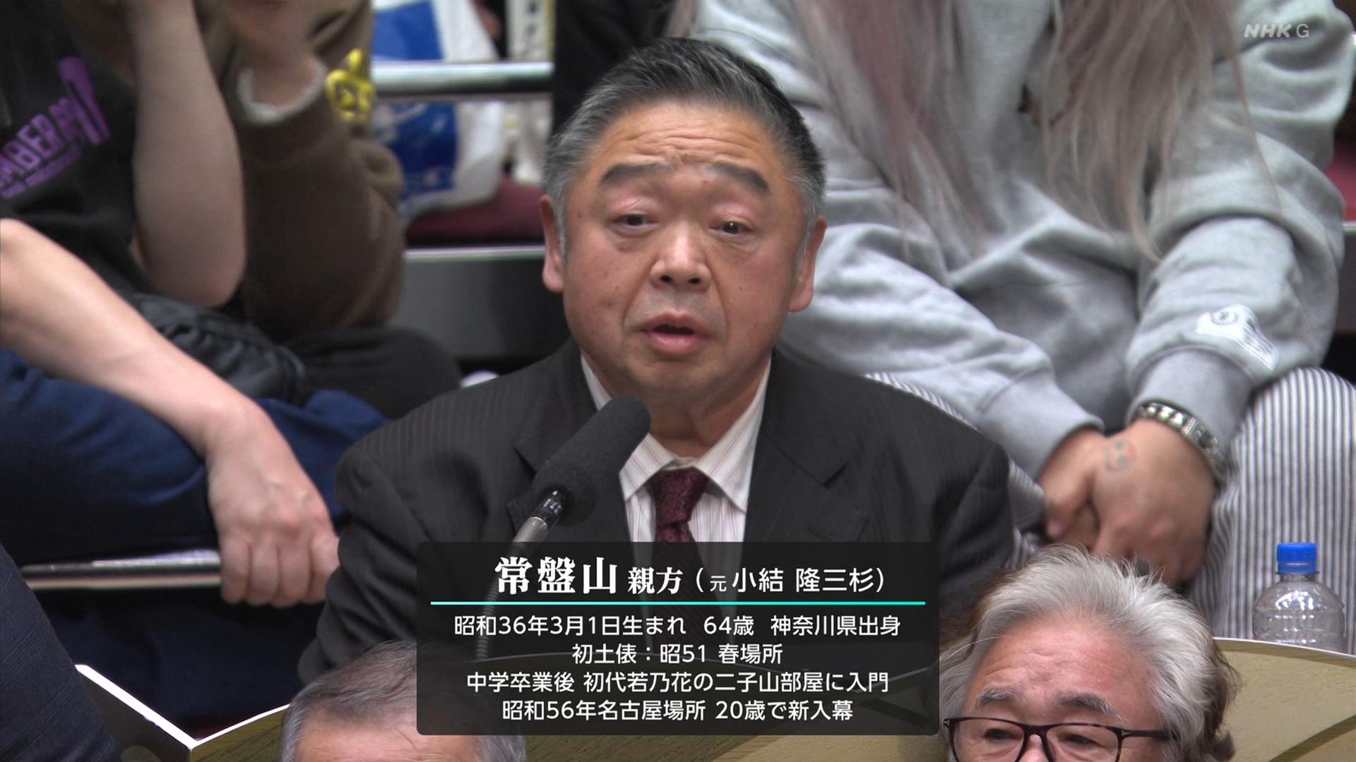 【解説】正面 尾車親方〔元 琴恵光関〕、向正面 若者頭 虎伏山〔元 虎伏山〕