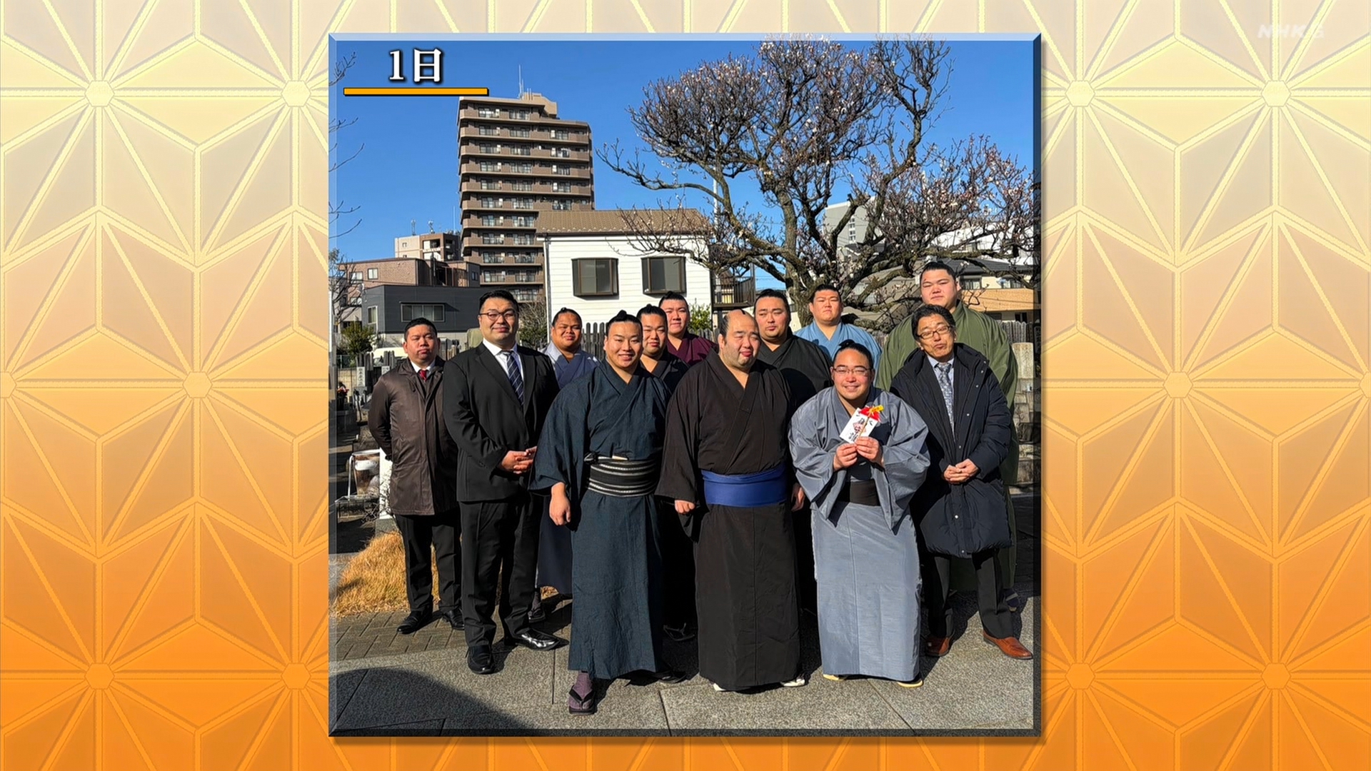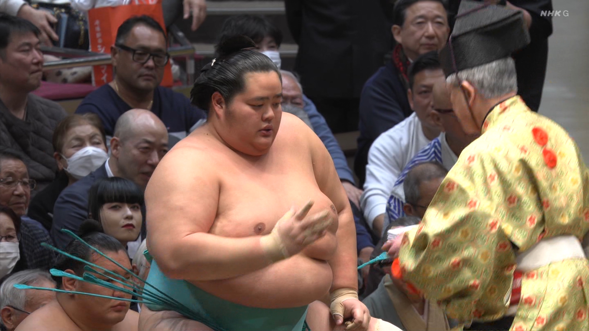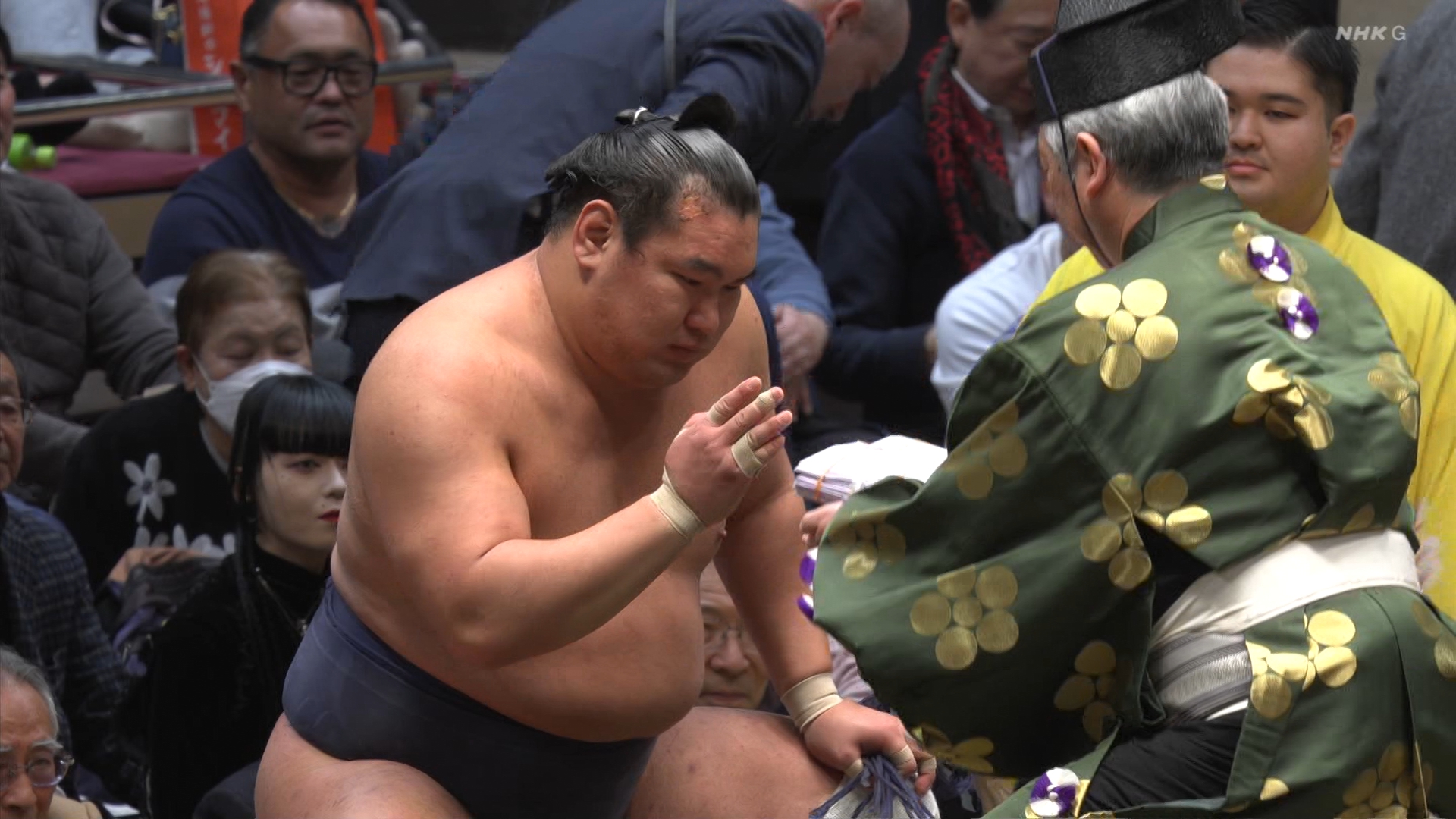 【解説】正面 尾車親方〔元 琴恵光関〕、向正面 若者頭 虎伏山〔元 虎伏山〕