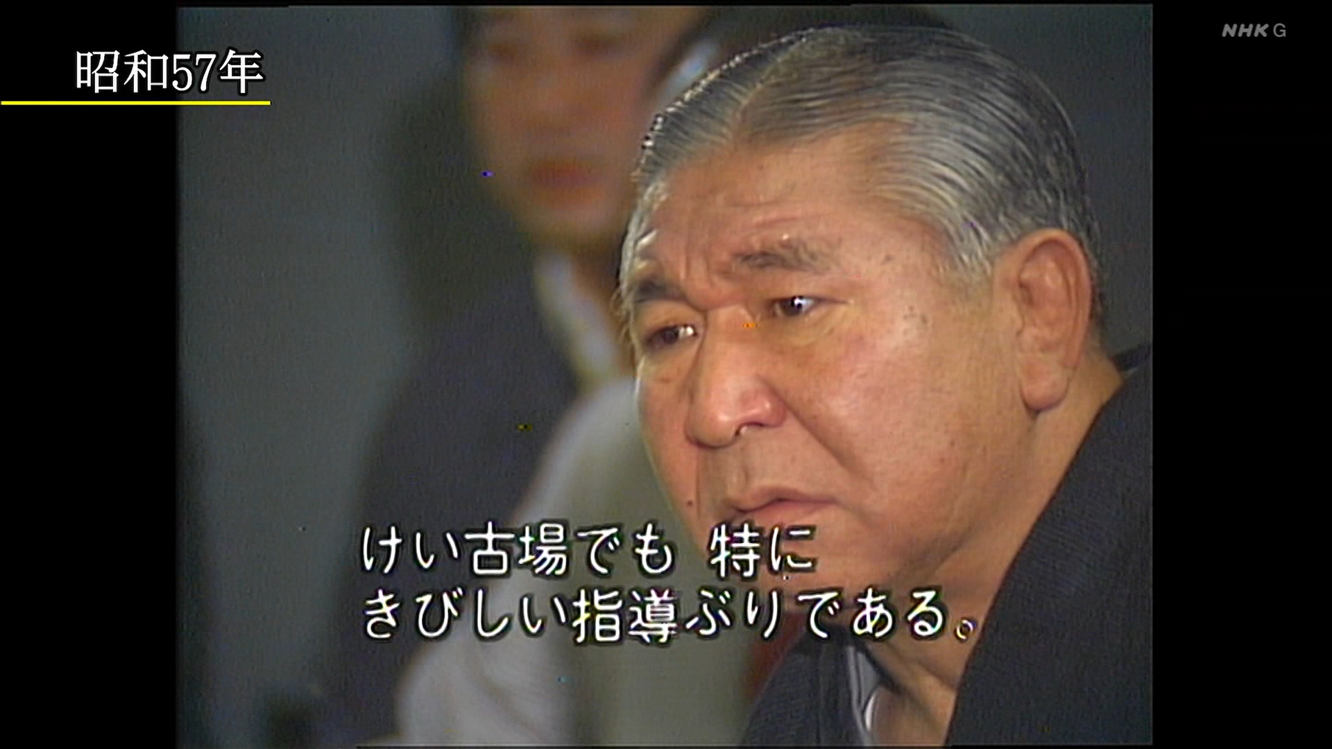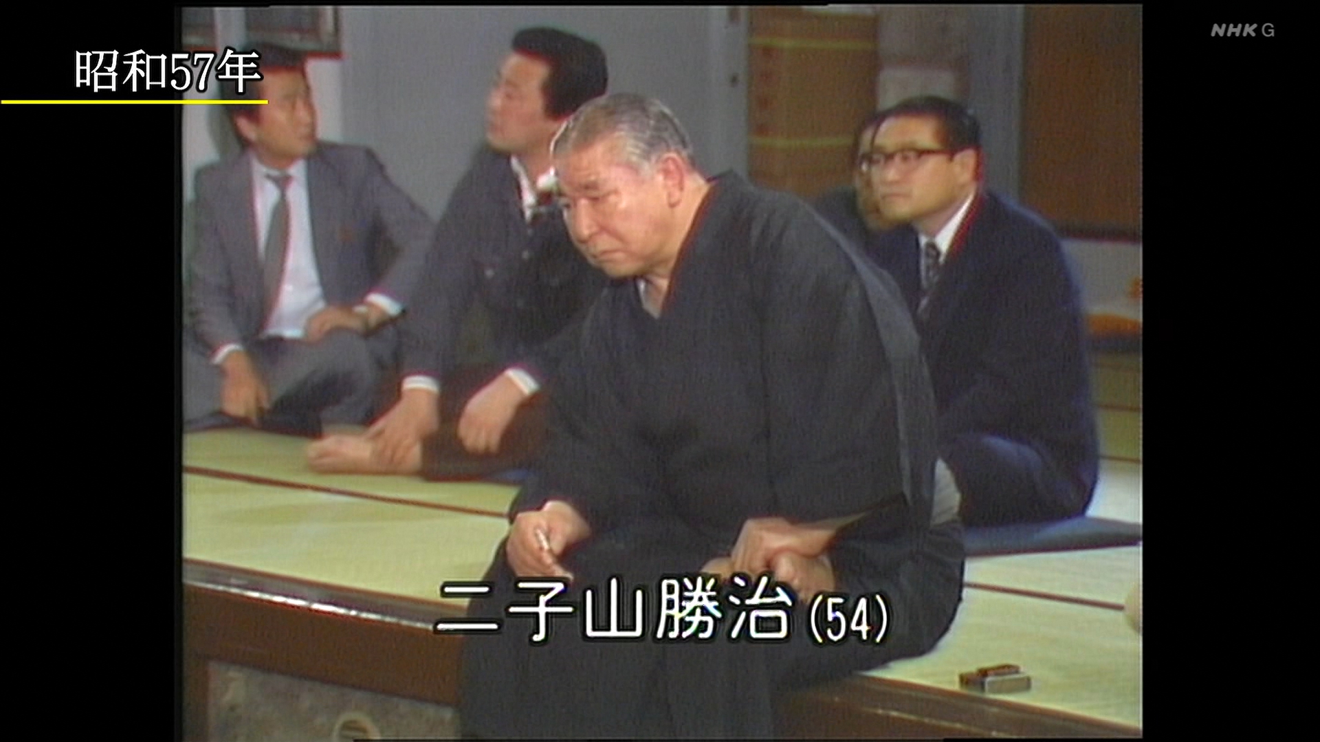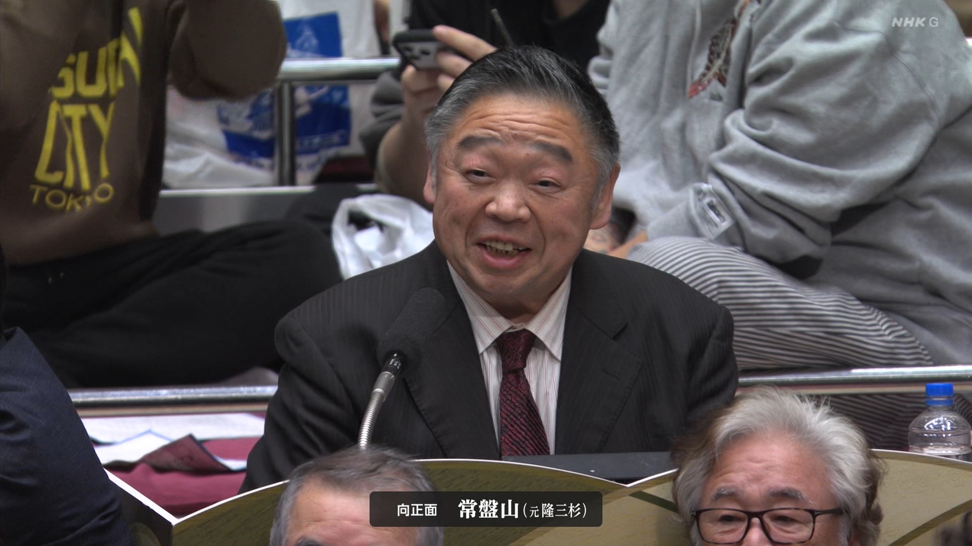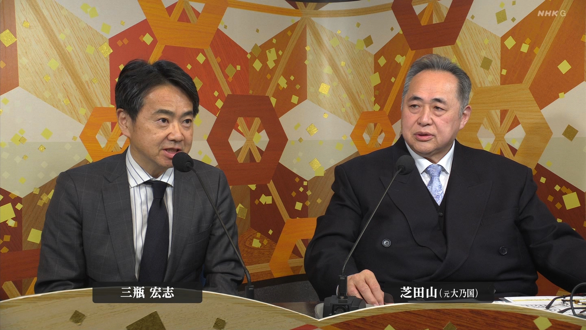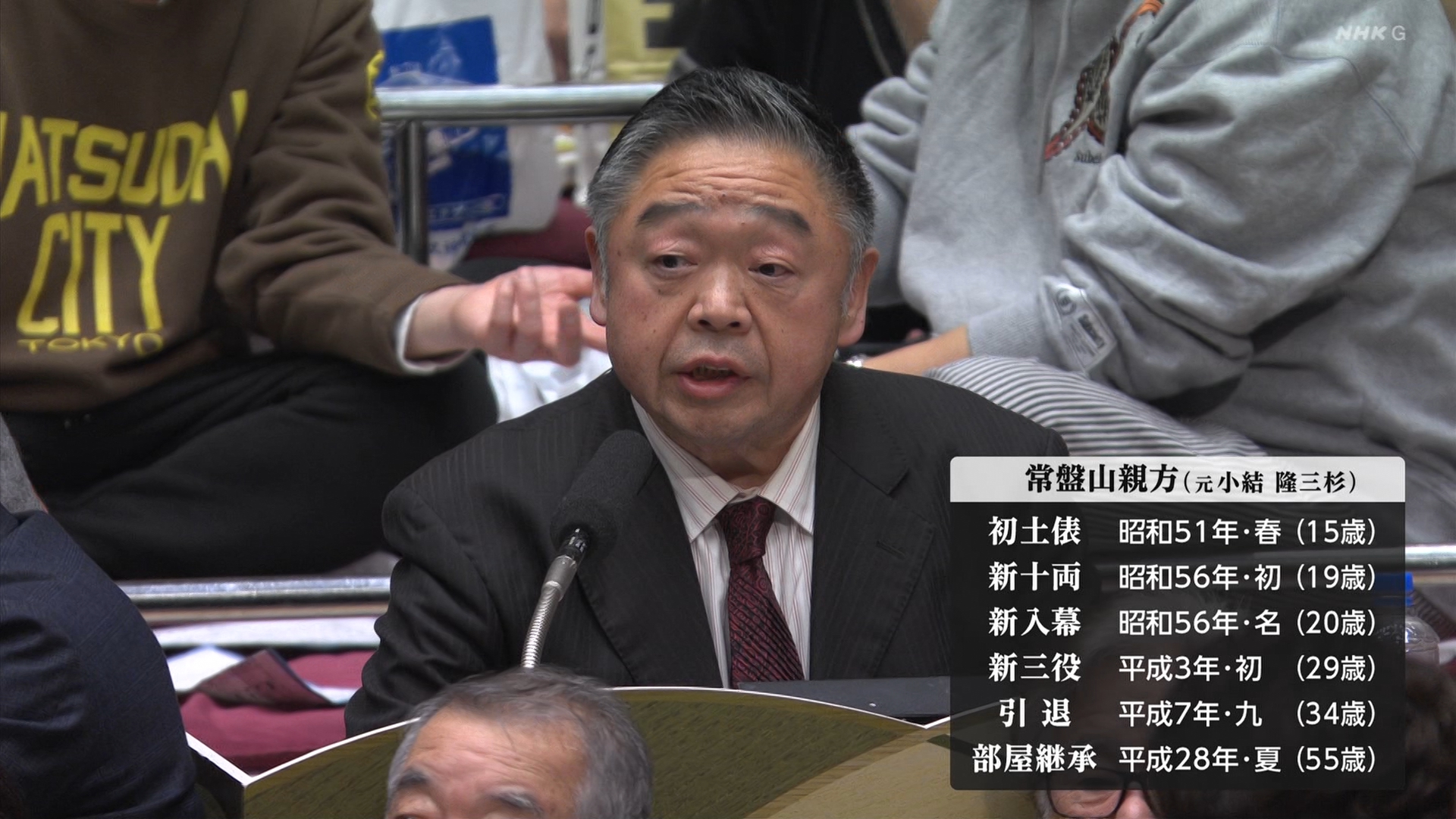【解説】正面 芝田山親方〔元横綱 大乃国関〕、向正面 常盤山親方(元小結 隆三杉関〕