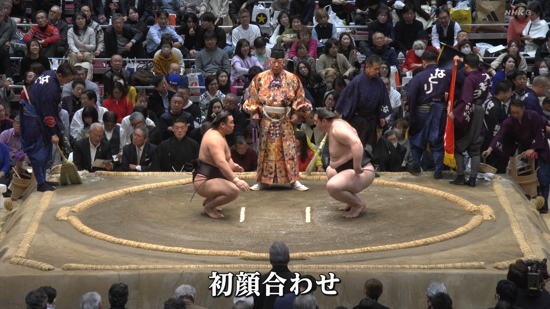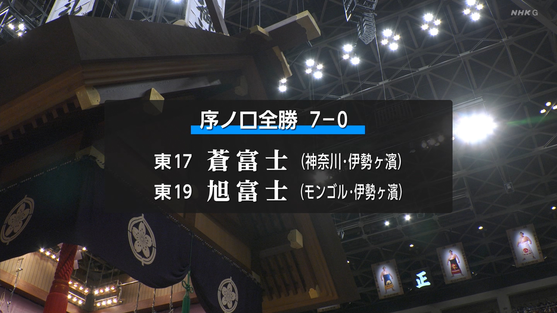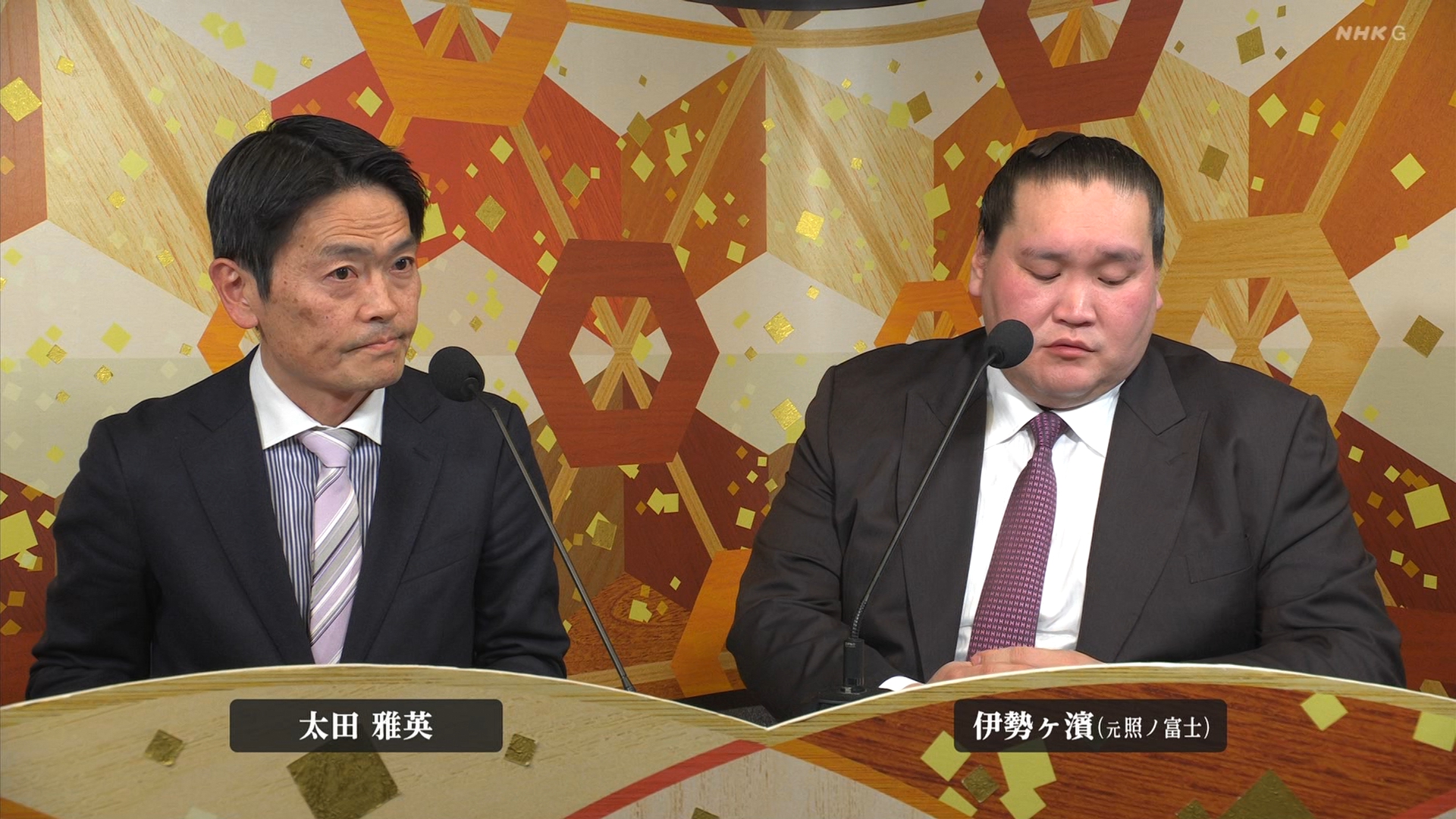 【解説】正面 伊勢ヶ濱親方〔元横綱 照ノ富士関〕、向正面 振分親方〔元関脇 妙義龍関〕