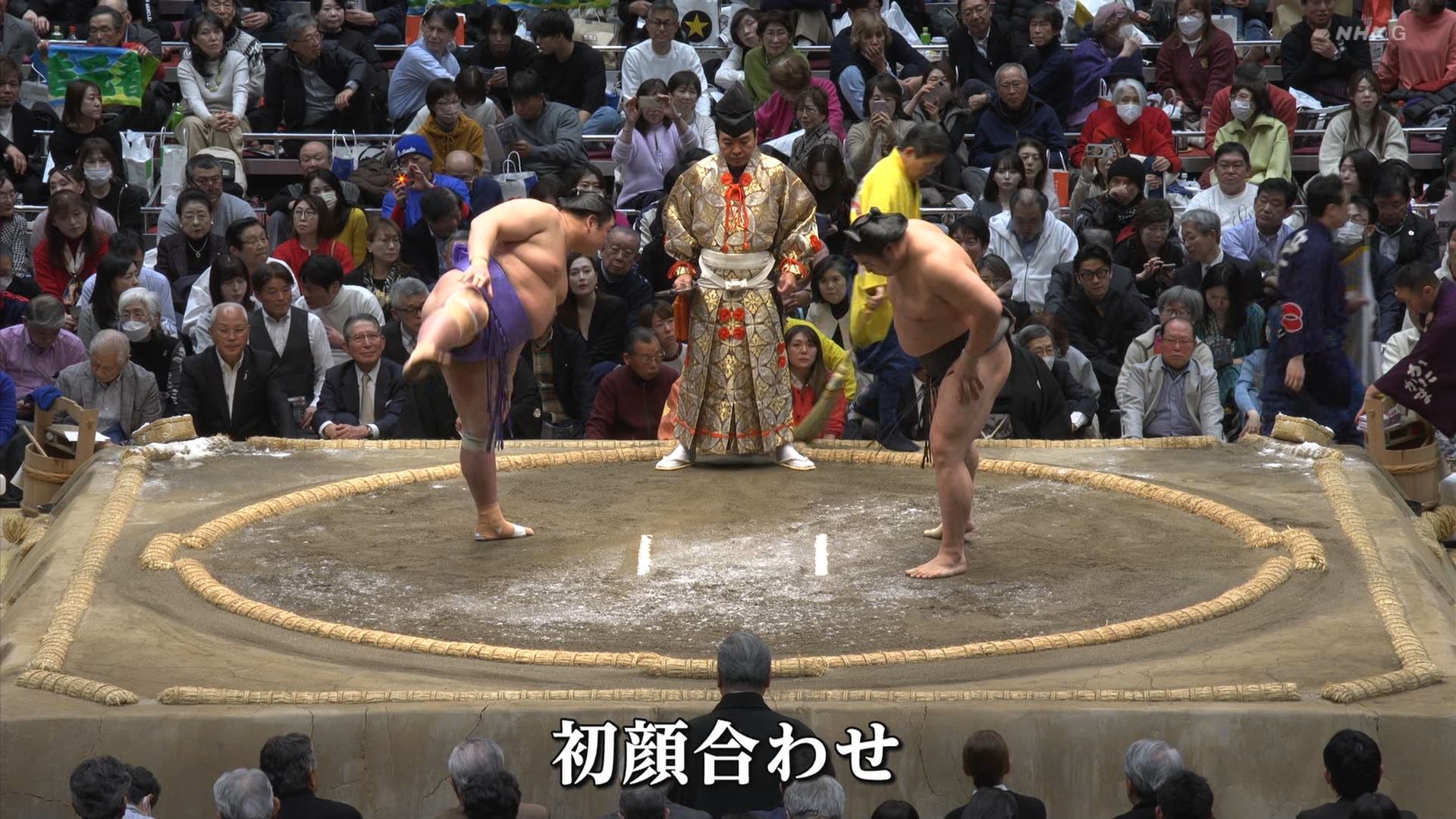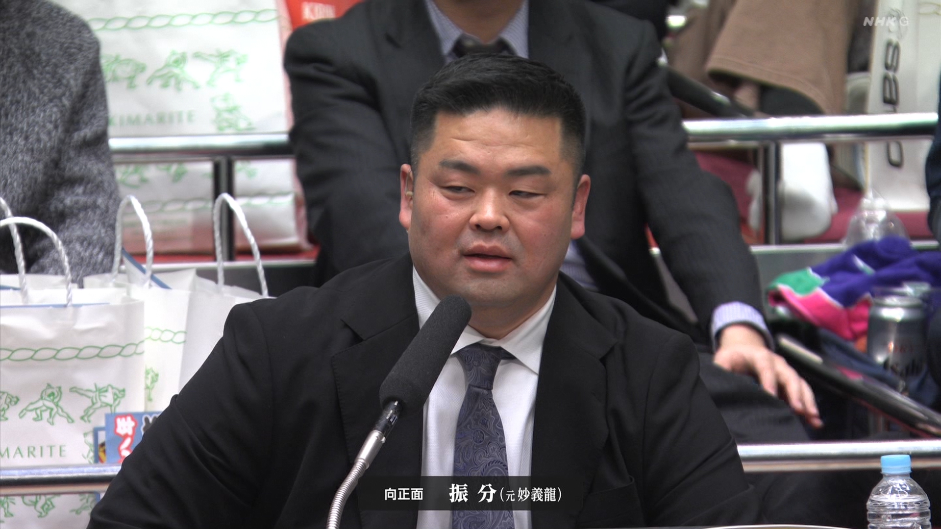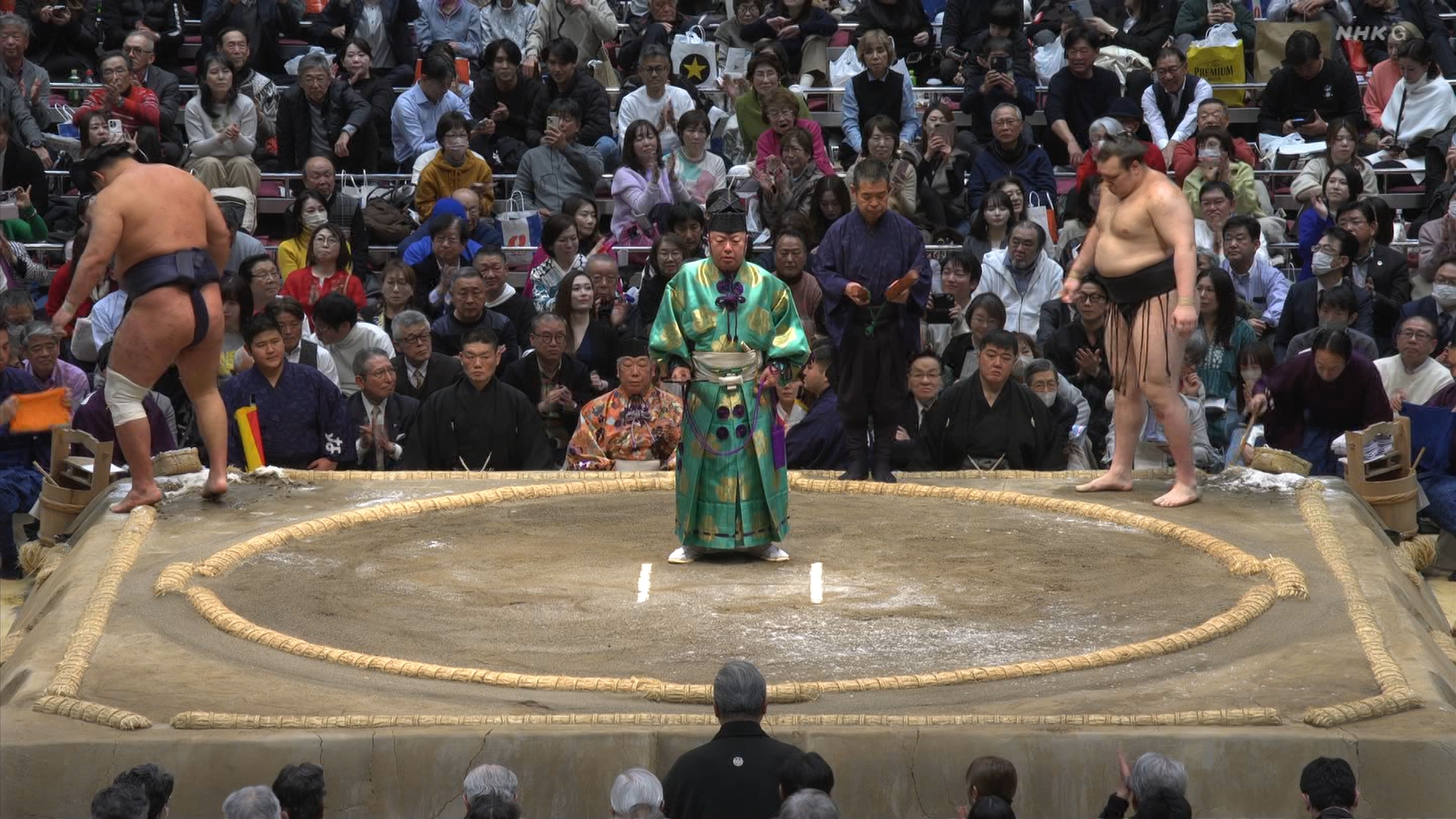 【解説】正面 伊勢ヶ濱親方〔元横綱 照ノ富士関〕、向正面 振分親方〔元関脇 妙義龍関〕