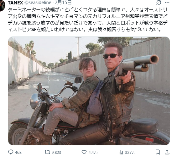| … | 229無題Name名無し 26/02/20(金)15:39:44No.8385531+ターミネーターシリーズは続くのだろうか |
