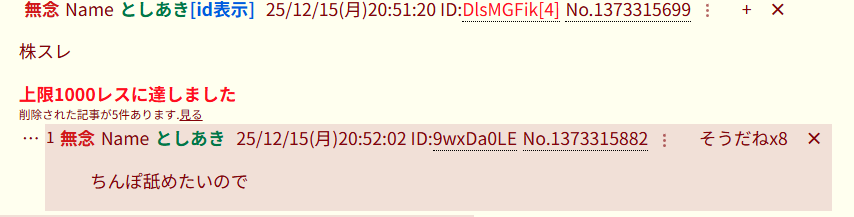 | … | 48無題Nameとしあき 25/12/14(日)21:45:45No.18073614そうだねx1ストプルスレほとんどレスつかないな… |