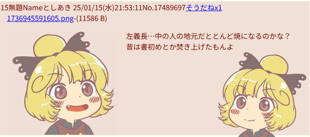| … | 19無題Nameとしあき 26/01/14(水)22:00:24No.18117635+>左義長を知らず |