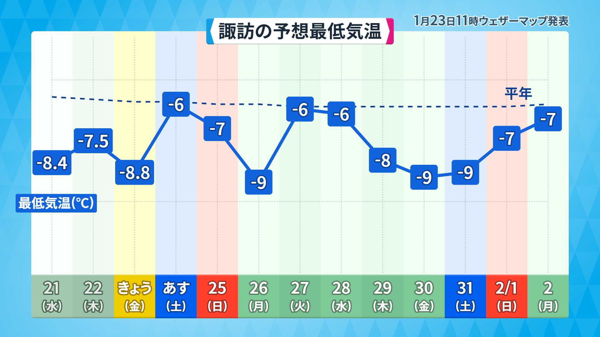 | … | 39無題Nameとしあき 26/01/24(土)08:22:21No.18130150そうだねx1>諏訪市の気温は、23日朝7時半ごろの時点で、マイナス8.8度と冷え込みましたが、湖面全体が氷で覆われる「全面結氷」とはなりませんでした |