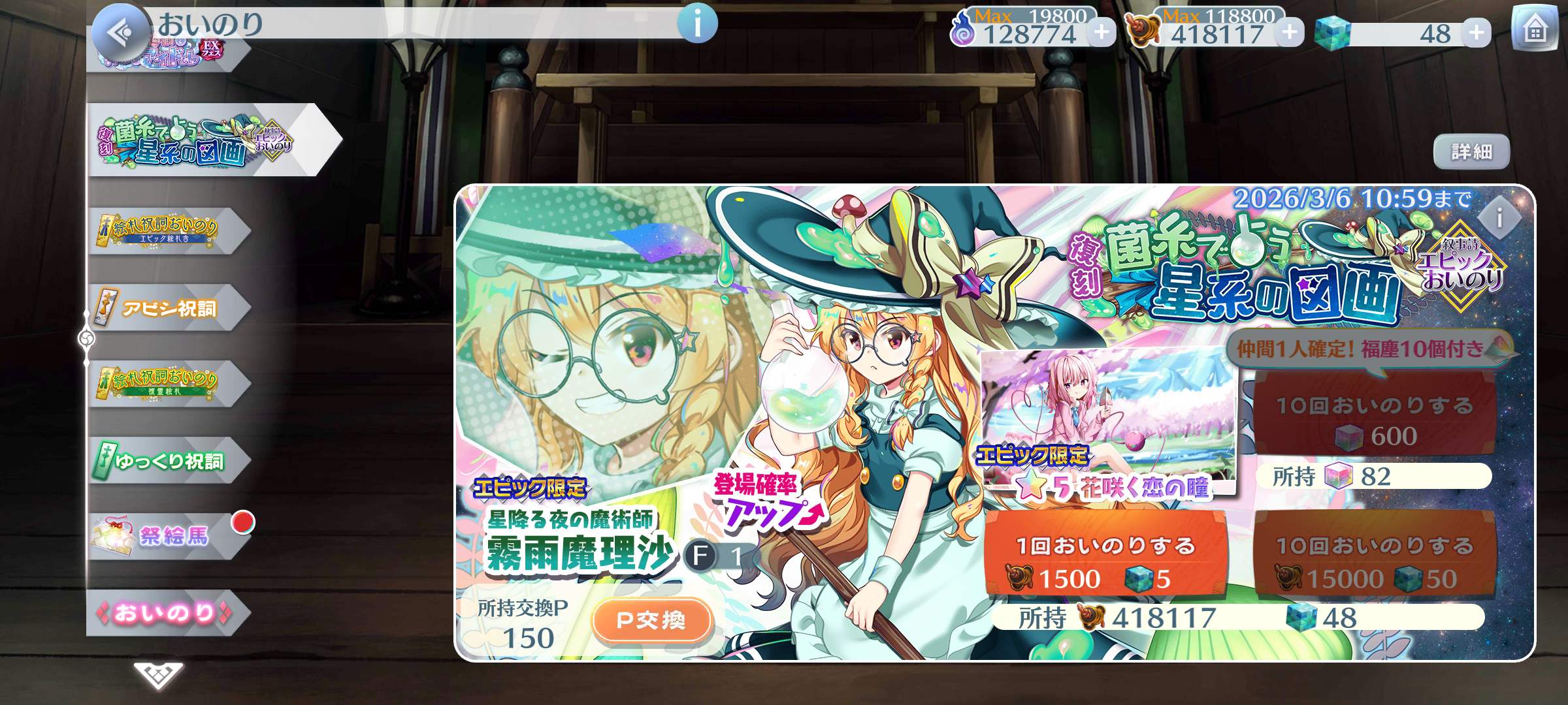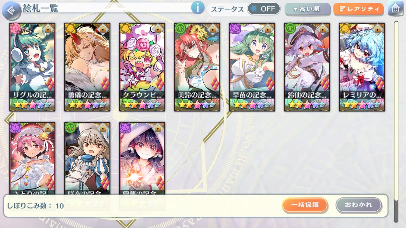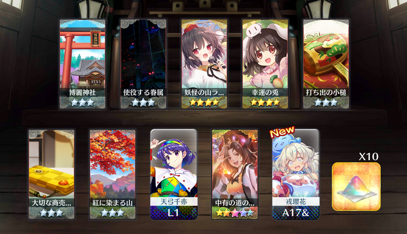 | … | 63無題Nameとしあき 26/02/20(金)23:45:32 ID:WSGj925.No.18168414そうだねx1緑魔理沙15回回したが出ず、残り封結晶600、6周年が控えてるから回すか悩む |