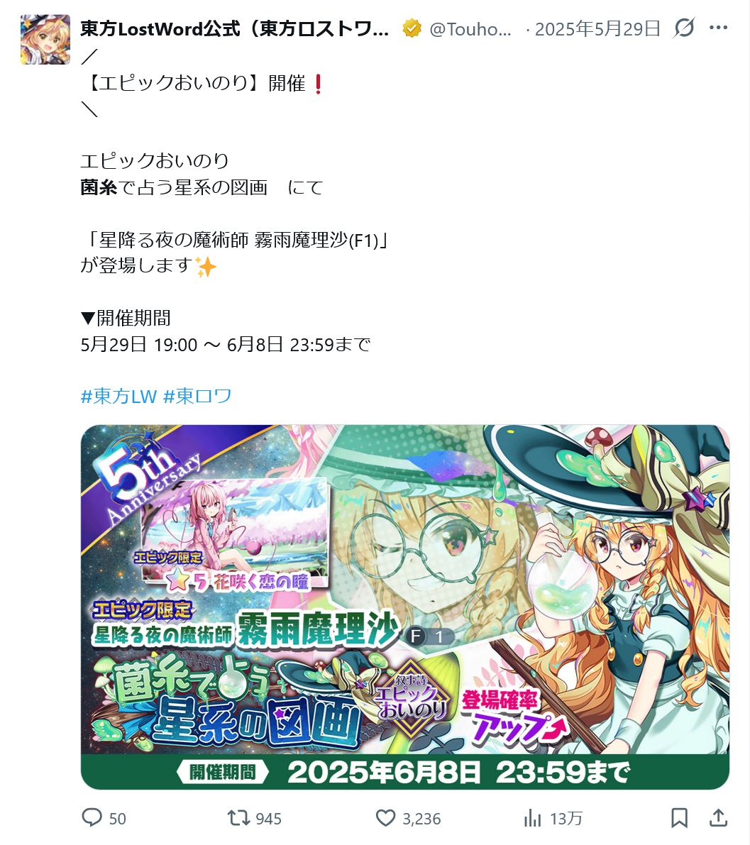 | … | 56無題Nameとしあき 26/02/20(金)23:01:23 ID:2mKF4voINo.18168324そうだねx2そういえばキノコ魔理沙は生放送での発表前にメンテ明けと同時に実装だったからスレが混乱していたな |