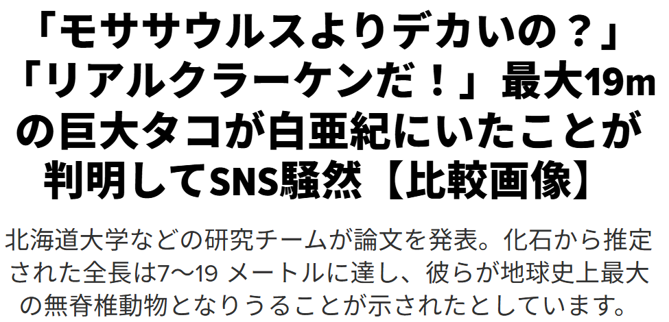| … | 23無題Nameとしあき 26/04/24(金)18:24:13No.18245880+現存の頭足類の中の有触毛亜目のサイズ比が多様だから推定サイズの幅が凄いことになってるらしい |