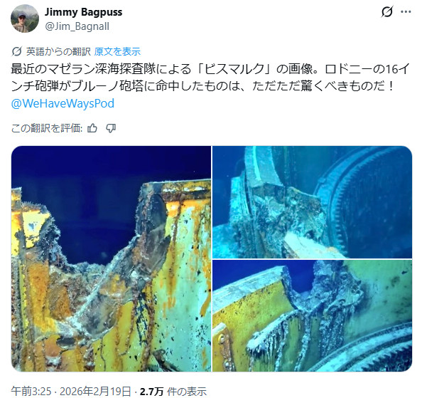 | … | 19無題Nameとしあき 26/02/20(金)08:33:41No.25471072そうだねx4 1771544021260.jpg-(21974 B) >>ロドニーに撃ち込まれた跡が残ってるんだそうな |