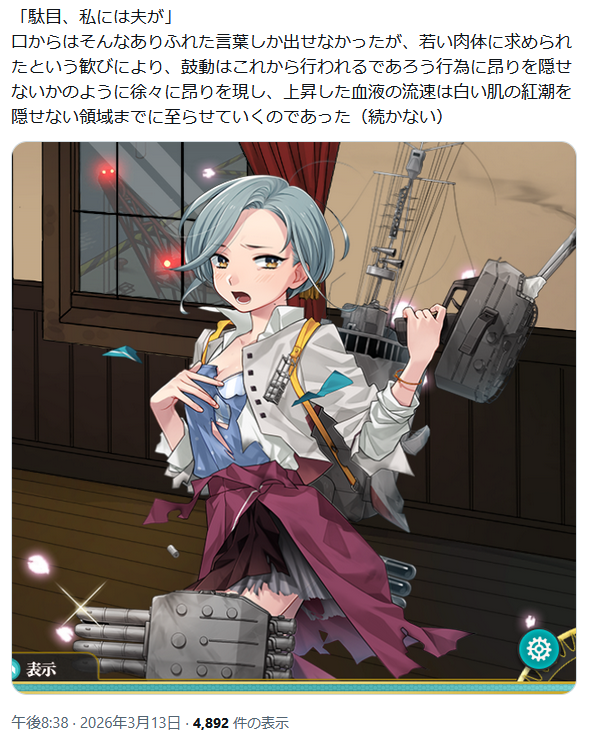 | … | 998無題Nameとしあき 26/03/13(金)19:42:01No.25496084+「かや」が進水した暁にはどうなるのかや?(初春ガール) |