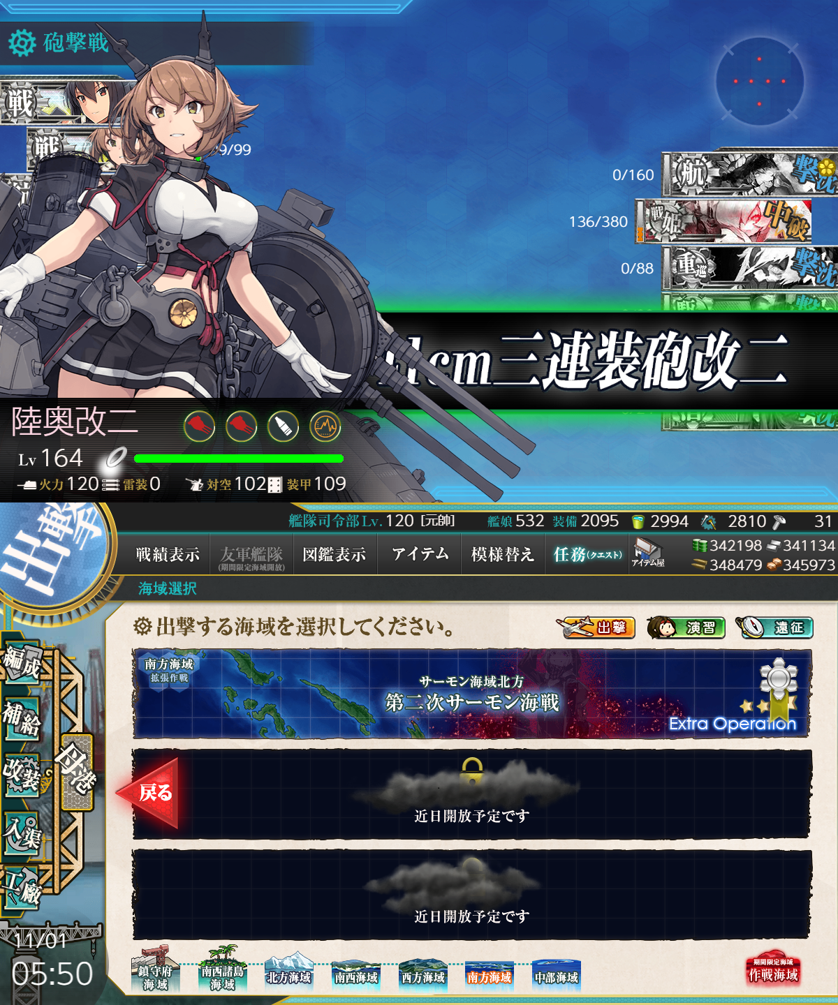 | … | 100無題Nameとしあき 25/11/01(土)02:47:47No.25315286+まだ寝ぼけてたから第2艦隊以降を全て遠征に出し直してしまって支援艦隊が出せないから取り合えず6-5をやるぞ磯波ィ!  |