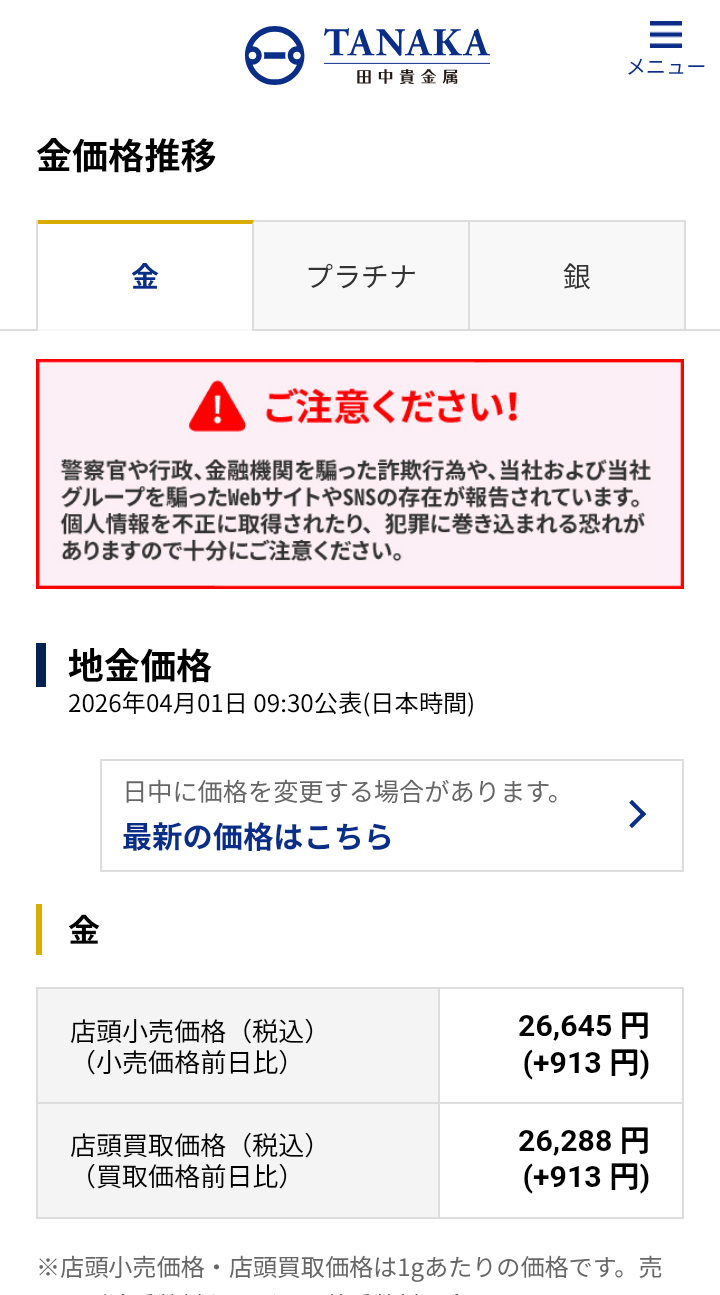 | … | 77無題Nameとしあき 26/04/01(水)19:27:47No.25518630+>ざっくりと24金1gの今の値段 |