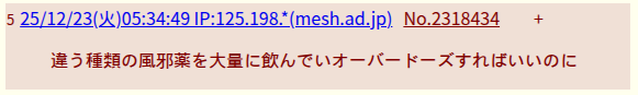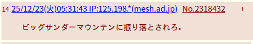 | … | 45無題Nameとしあき 25/12/22(月)19:24:09No.21253+書き込みをした人によって削除されました |