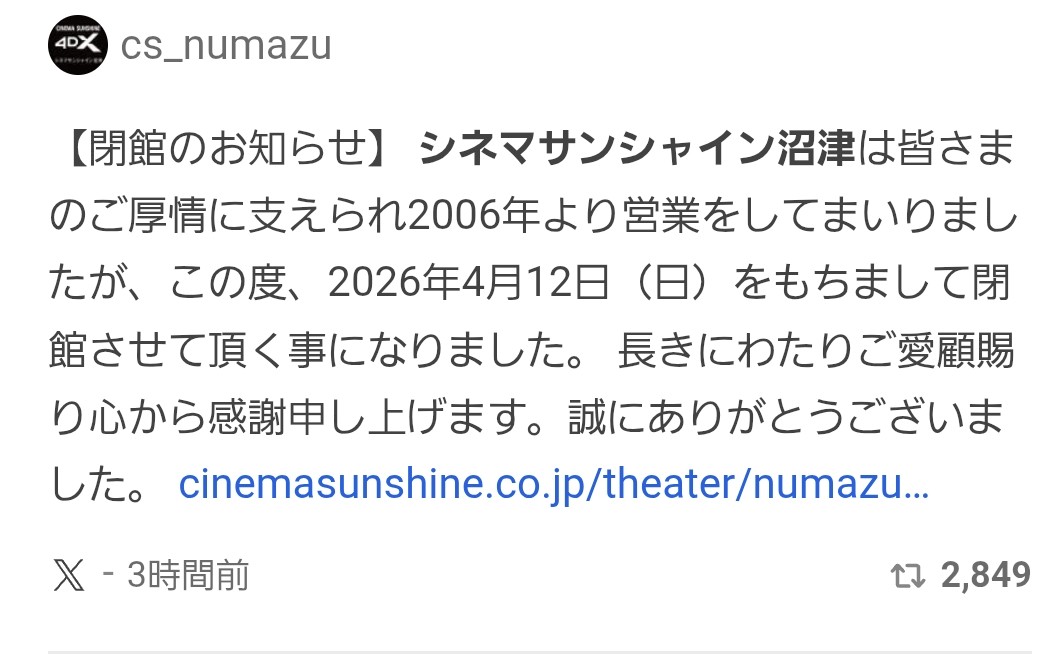 シネマサンシャイン沼津が来年の4月を以て閉館になるそうで