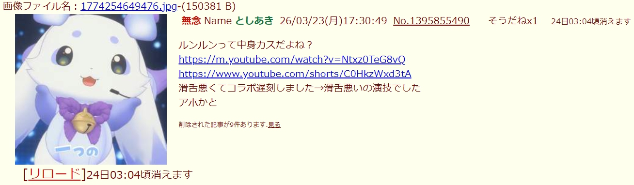 | … | 11無題Name名無し 26/03/17(火)04:54:42 IP:183.76.*(asahi-net.or.jp)No.105739+書き込みをした人によって削除されました |