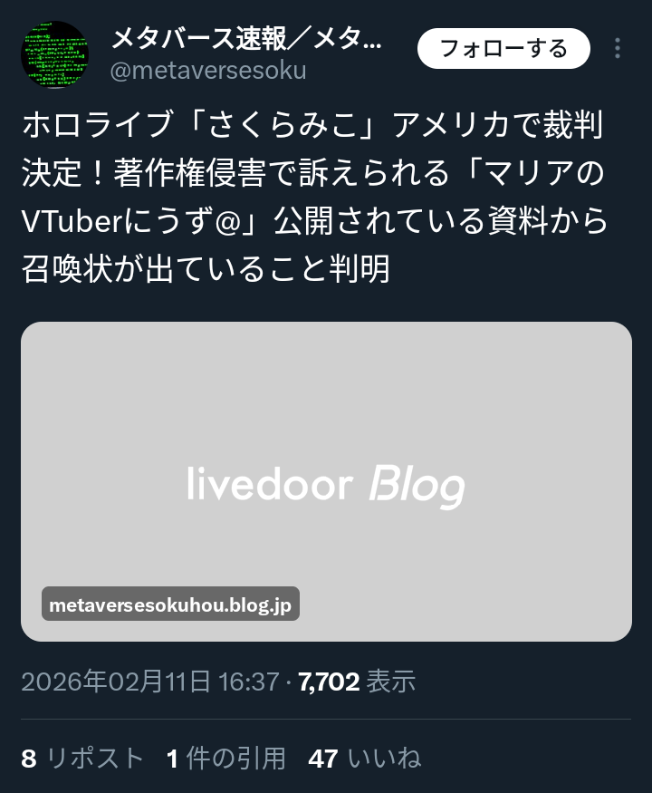 | … | 1996無題Name名無し 26/02/12(木)08:47:31No.1945983そうだねx36 1770853651025.png-(115692 B) >Vtuberのニュース→スルー |