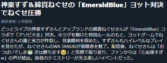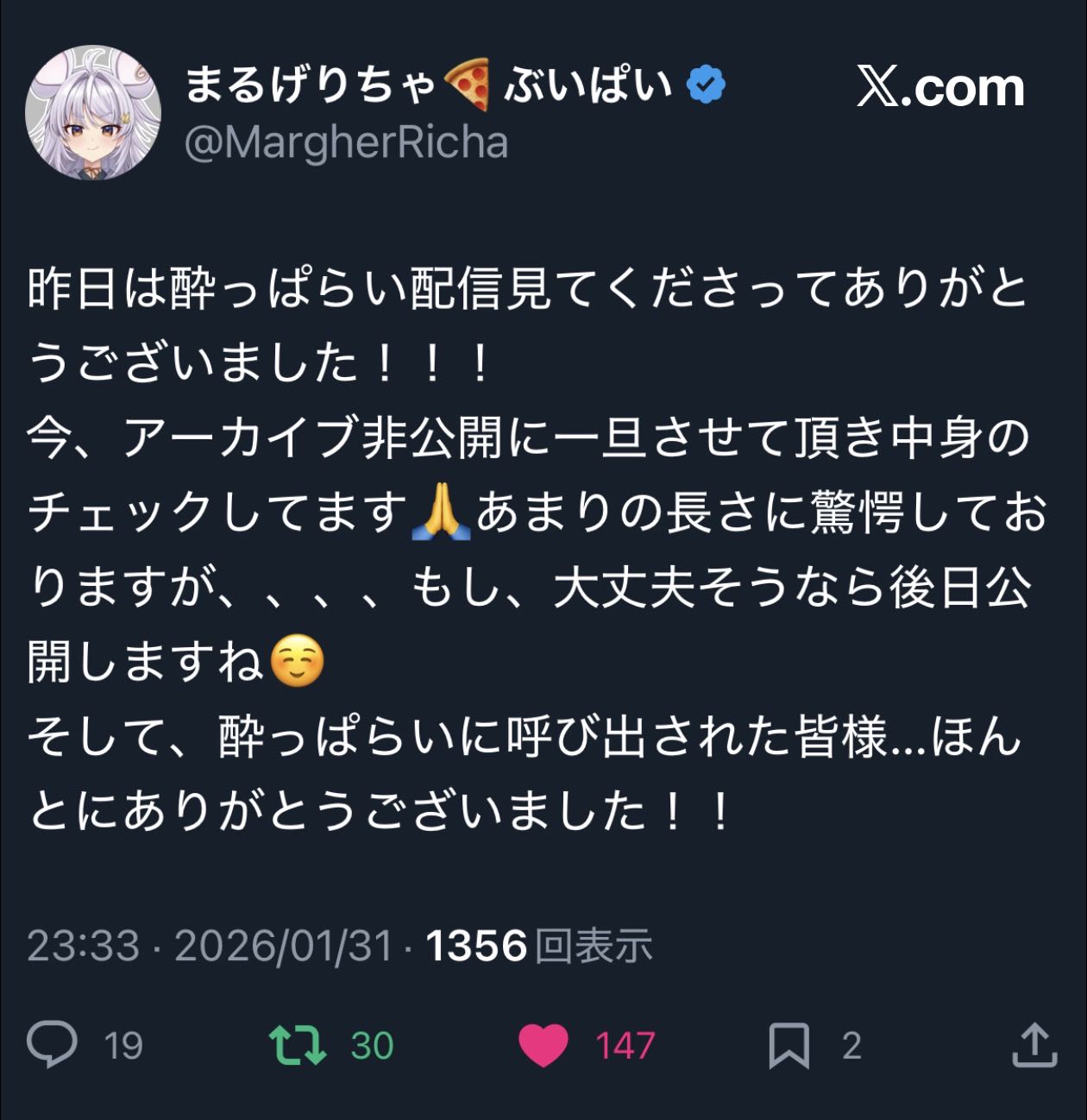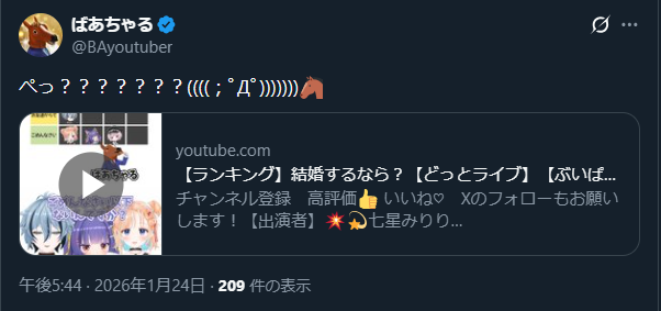| … | 580無題Name名無し 26/02/01(日)03:15:12No.1942272そうだねx1アーカイブはメン限になっちゃったけど馬のマシュマロ設定配信めちゃ面白かった |