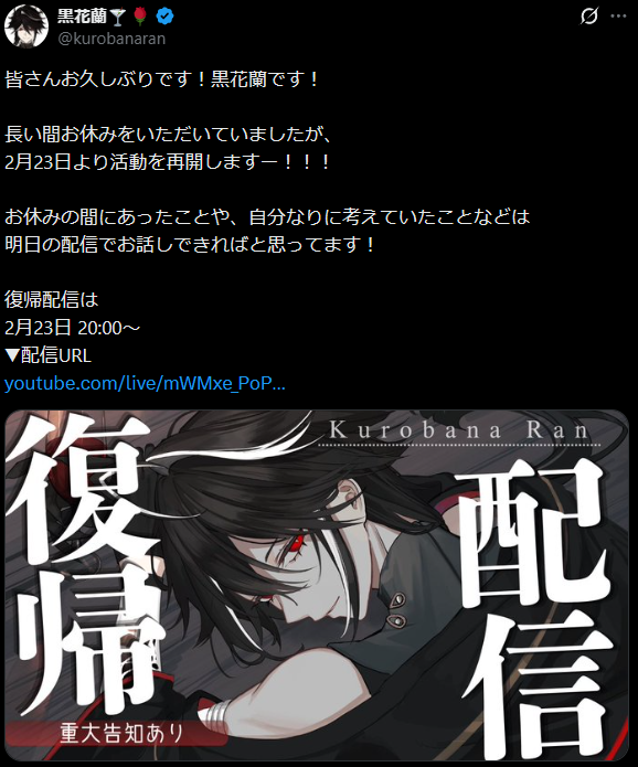 | … | 7無題Name名無し 26/02/22(日)22:20:22No.1950798そうだねx1 1771766422421.png-(331364 B) ゆにれいどで休止してた黒花蘭があした復帰 |