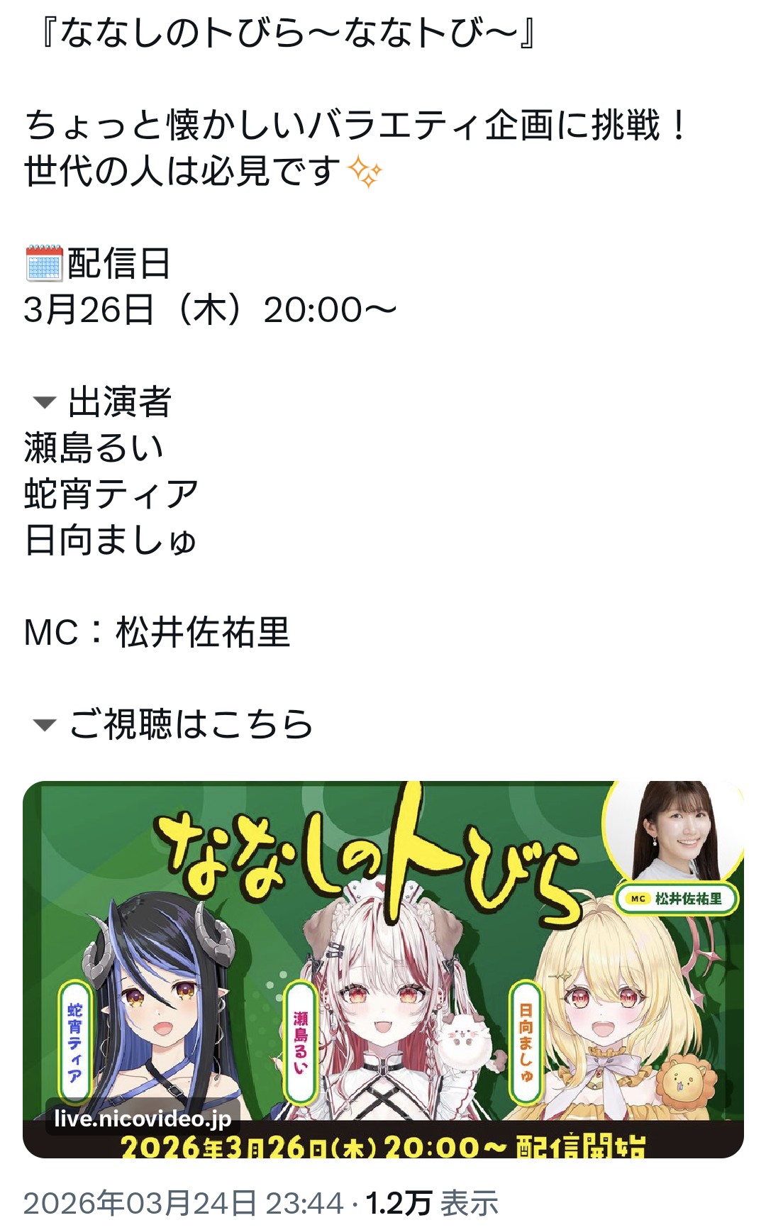| … | 12無題Name名無し 26/03/24(火)09:15:21 IP:120.51.*(vectant.ne.jp)No.1959898そうだねx6 1774311321087.jpg-(304969 B) すばるしゃん主催の歌枠リレーにカミ |