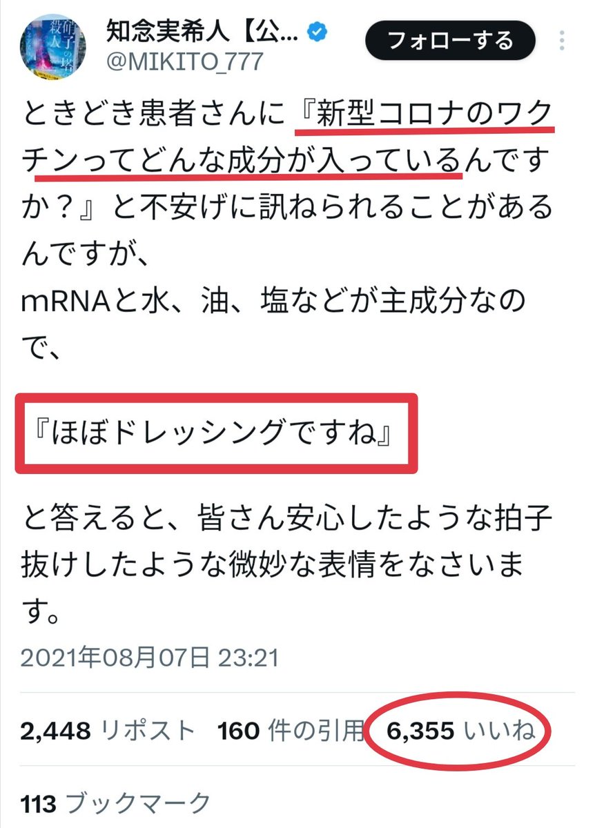 | … | 3無題Name名無し 26/01/01(木)20:49:19No.204111+ 1767268159950.jpg-(126360 B) 知念実希人といえばコロナワクチンの成分を「ほぼドレッシング」と吹聴したデマ投稿も有名。 |