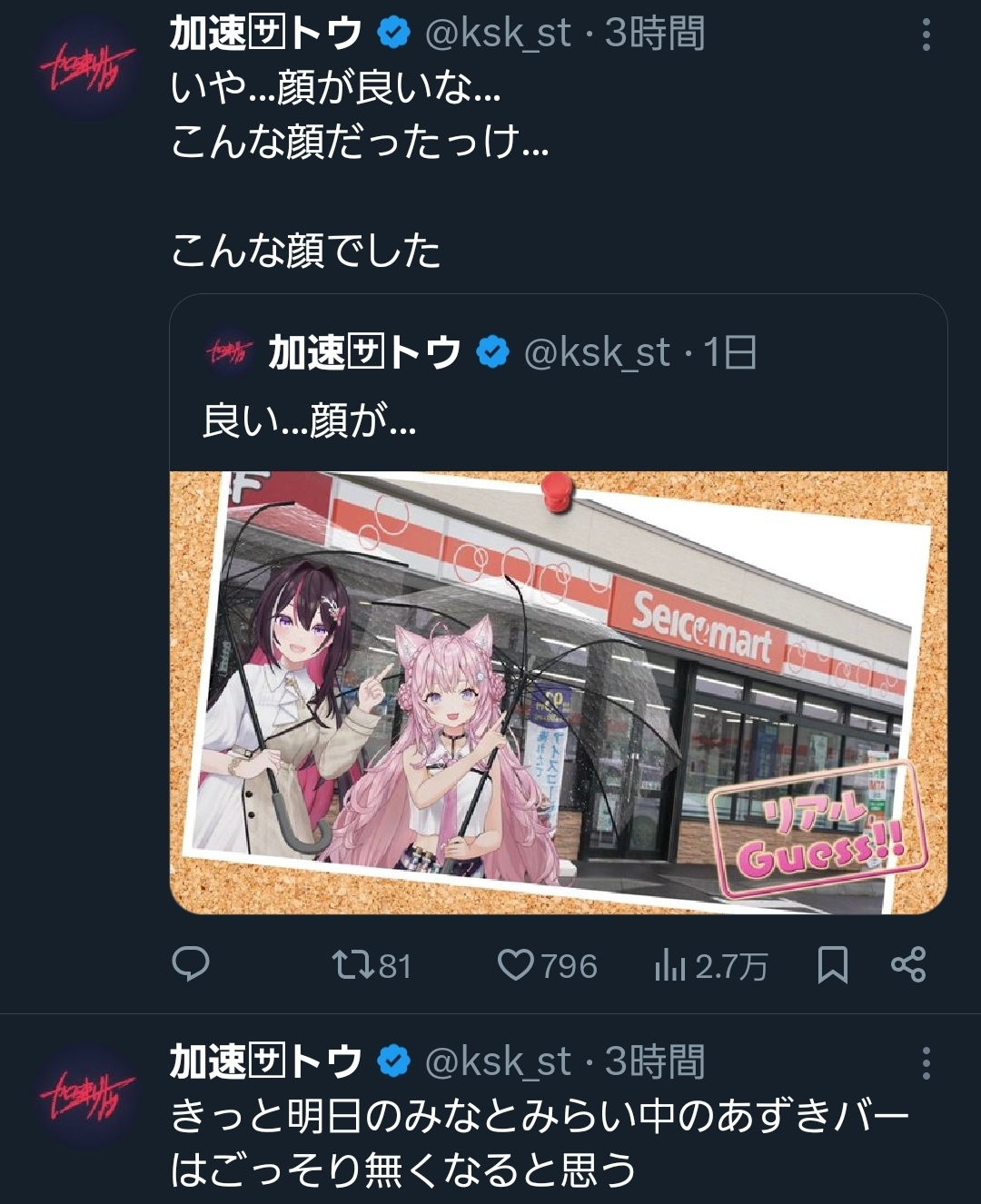| … | 995無題Name名無し 25/11/18(火)20:28:05No.10916867+これだけ注目を集めてコラボの紹介とかみこちはエリートか? |