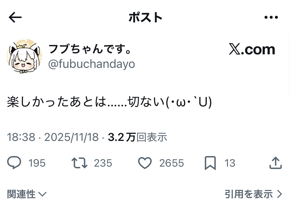 | … | 26無題Name名無し 25/11/18(火)13:04:55No.10915732+>いやあ、清楚な配信だったなあ |