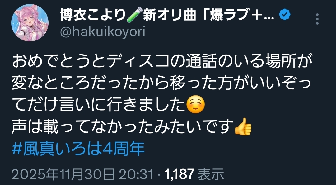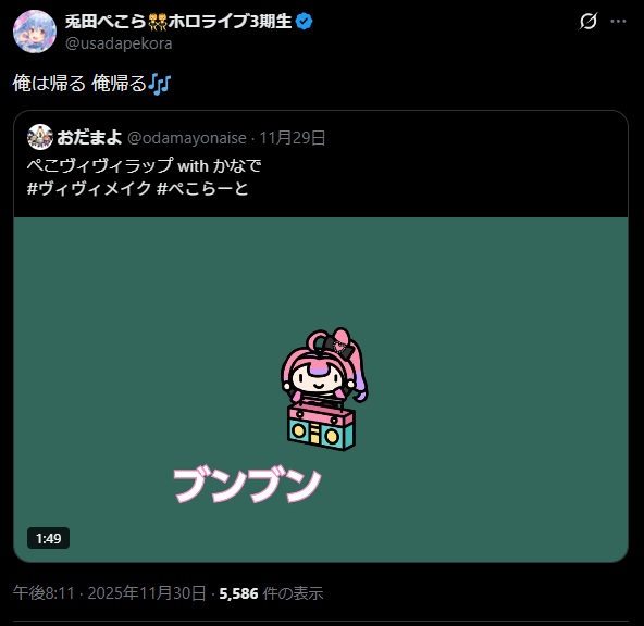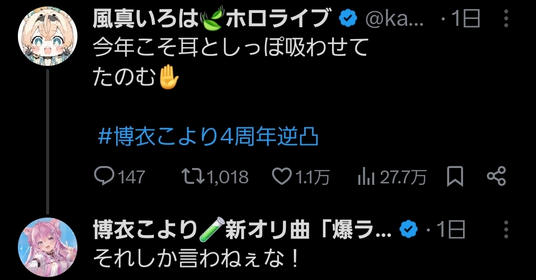 | … | 57無題Name名無し 25/11/30(日)20:10:05No.11021466+まあ記念配信見てるホロメンも何人かはいるだろう |