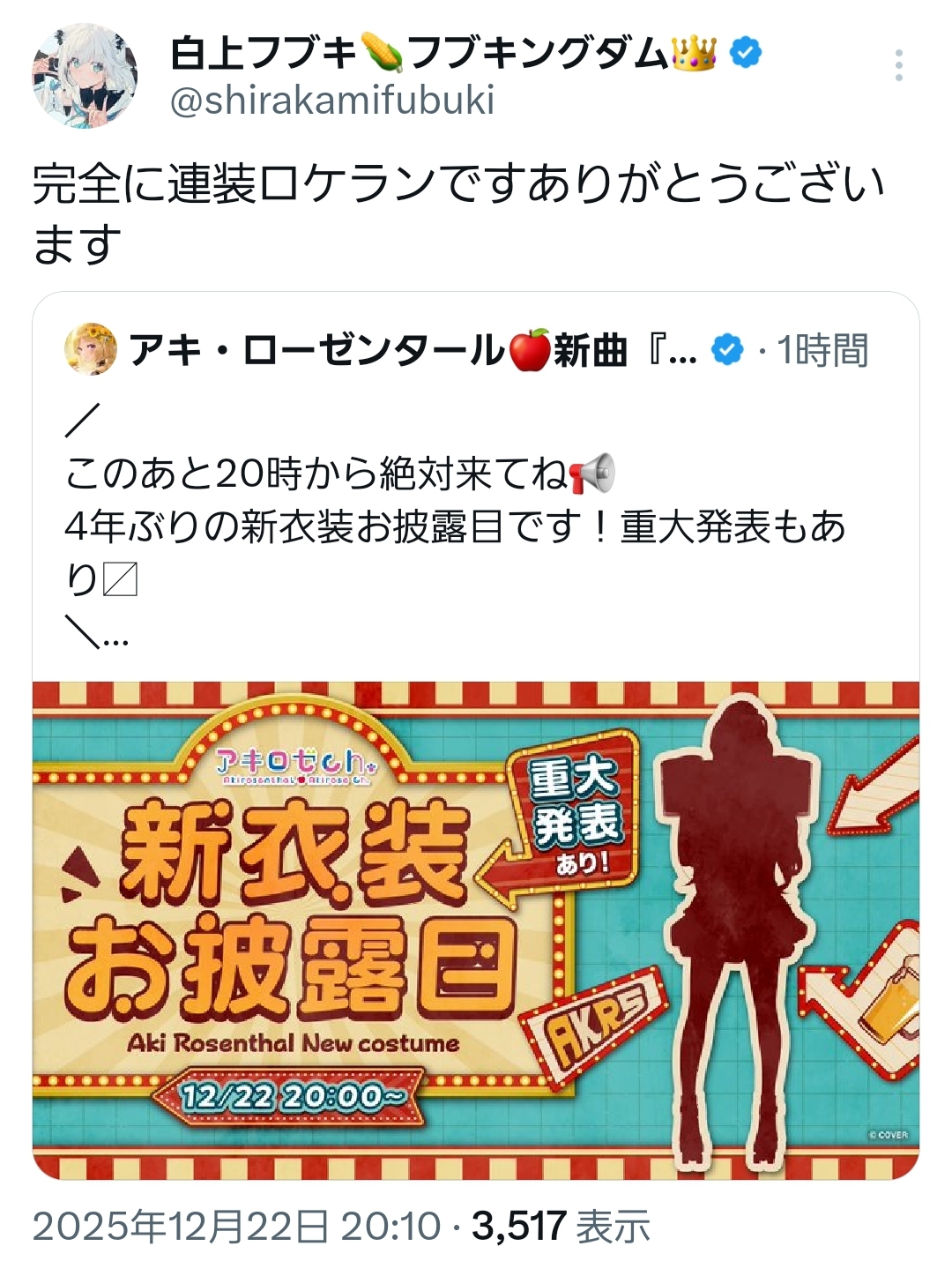 | … | 16無題Name名無し 25/12/22(月)20:00:12 IP:59.146.*(nuro.jp)No.11166072そうだねx2【新衣装お披露目&重大発表】 #アキロゼ新衣装 4年ぶりにお披露目!【アキロゼ/ホロライブ】 |