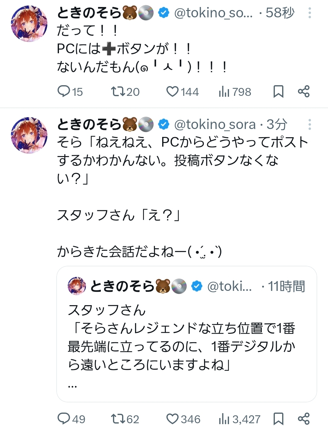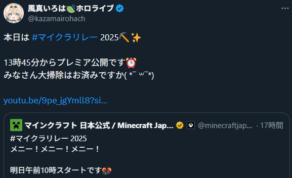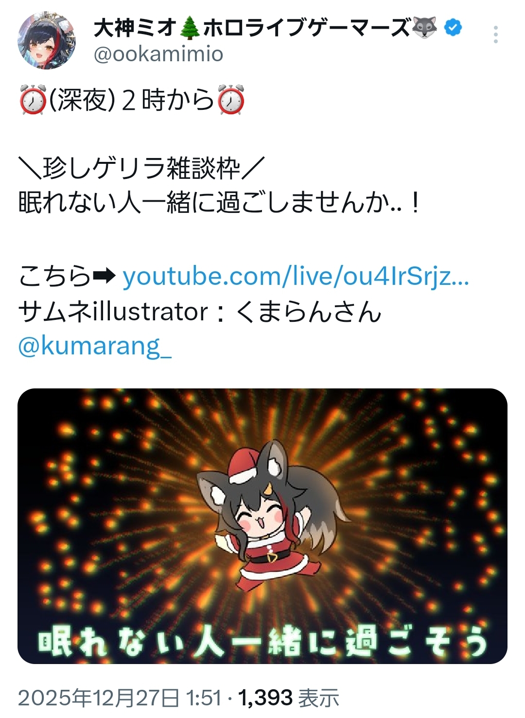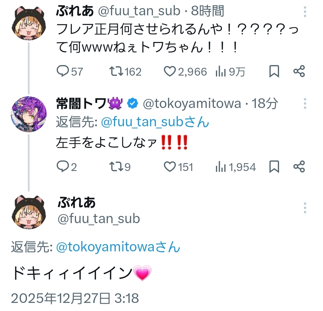 | … | 995無題Name名無し 25/12/27(土)11:11:52 IP:114.159.*(ocn.ne.jp)No.11203820+>>🐺「みこちもスバルも忙しい」 |