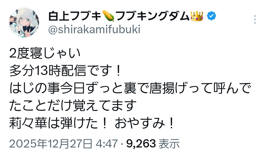 | … | 956無題Name名無し 25/12/27(土)11:05:10 IP:133.201.*(mesh.ad.jp)No.11203780+フブちゃんに関してはまあド珍歌うためだろう |