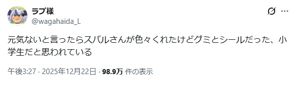 | … | 43無題Name名無し 25/12/26(金)23:42:47 IP:49.105.*(spmode.ne.jp)No.11202711そうだねx11 1766760167515.jpg-(763845 B) リアイベで甘い台詞をいう罰ゲームで難色を示した息子に客から飛ばされたヤジ |