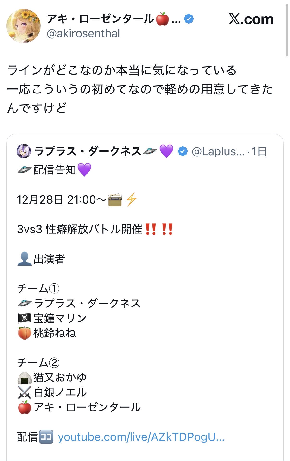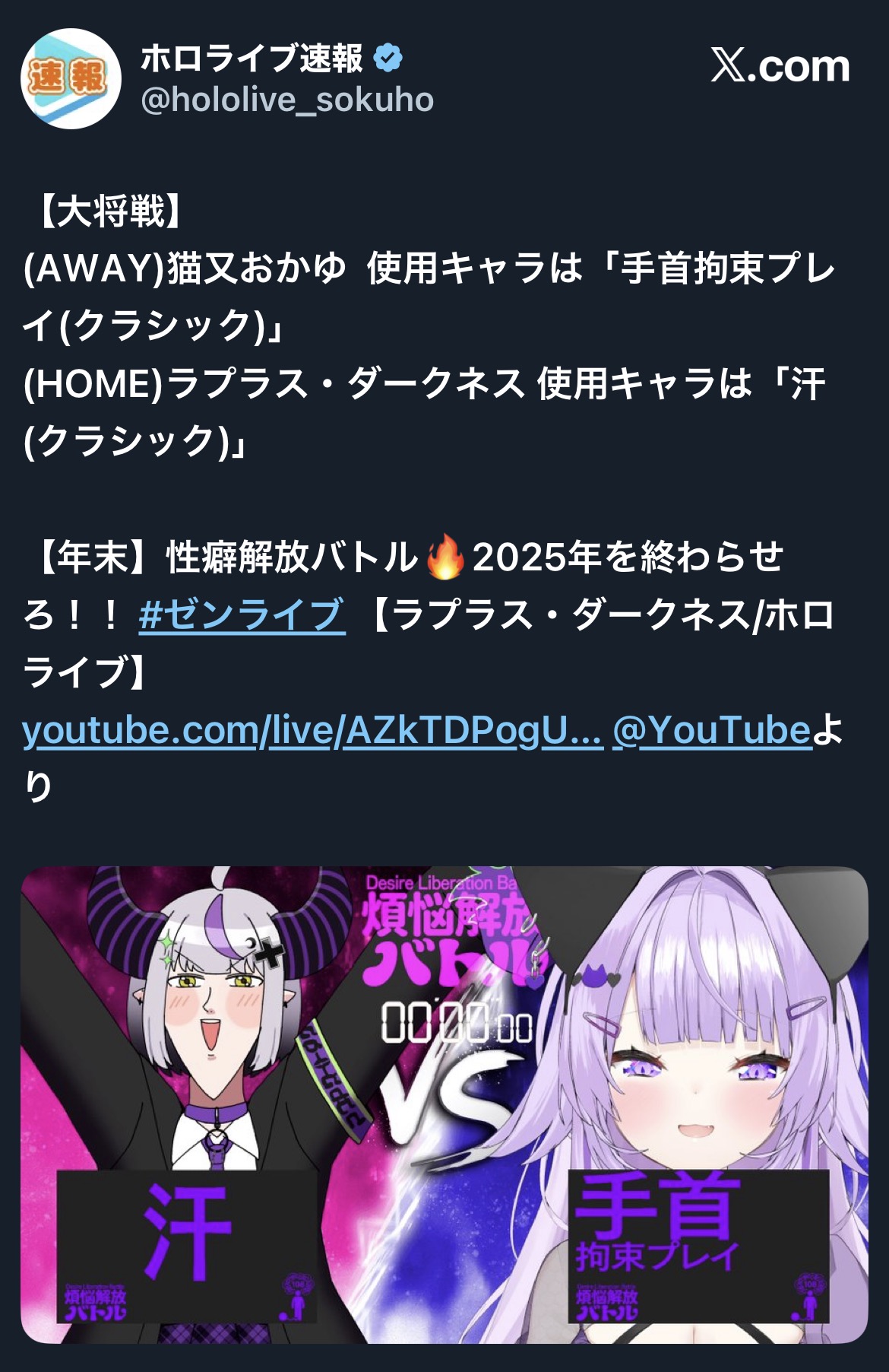 | … | 951無題Name名無し 25/12/28(日)22:02:23 IP:138.64.*(v6connect.net)No.11222491そうだねx1●先鋒:H桃鈴ねね vs Aアキ・ローゼンタール◯ |