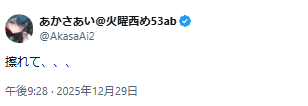 | … | 914無題Name名無し 25/12/29(月)21:38:33 IP:106.154.*(au-net.ne.jp)No.11238973+ねねちアウトでは? |