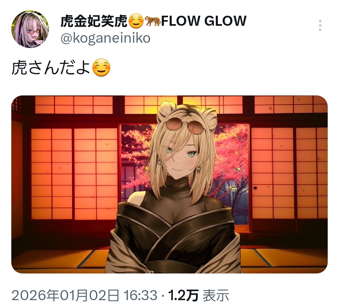 | … | 78無題Name名無し 26/01/02(金)16:29:37 IP:60.236.*(mesh.ad.jp)No.11294784+>にこたんは虎ではないけど |