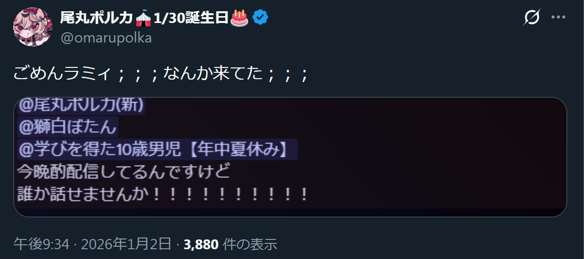 | … | 977無題Name名無し 26/01/02(金)22:22:32 IP:220.213.*(wakwak.ne.jp)No.11300810+大富豪の申し子スバル |