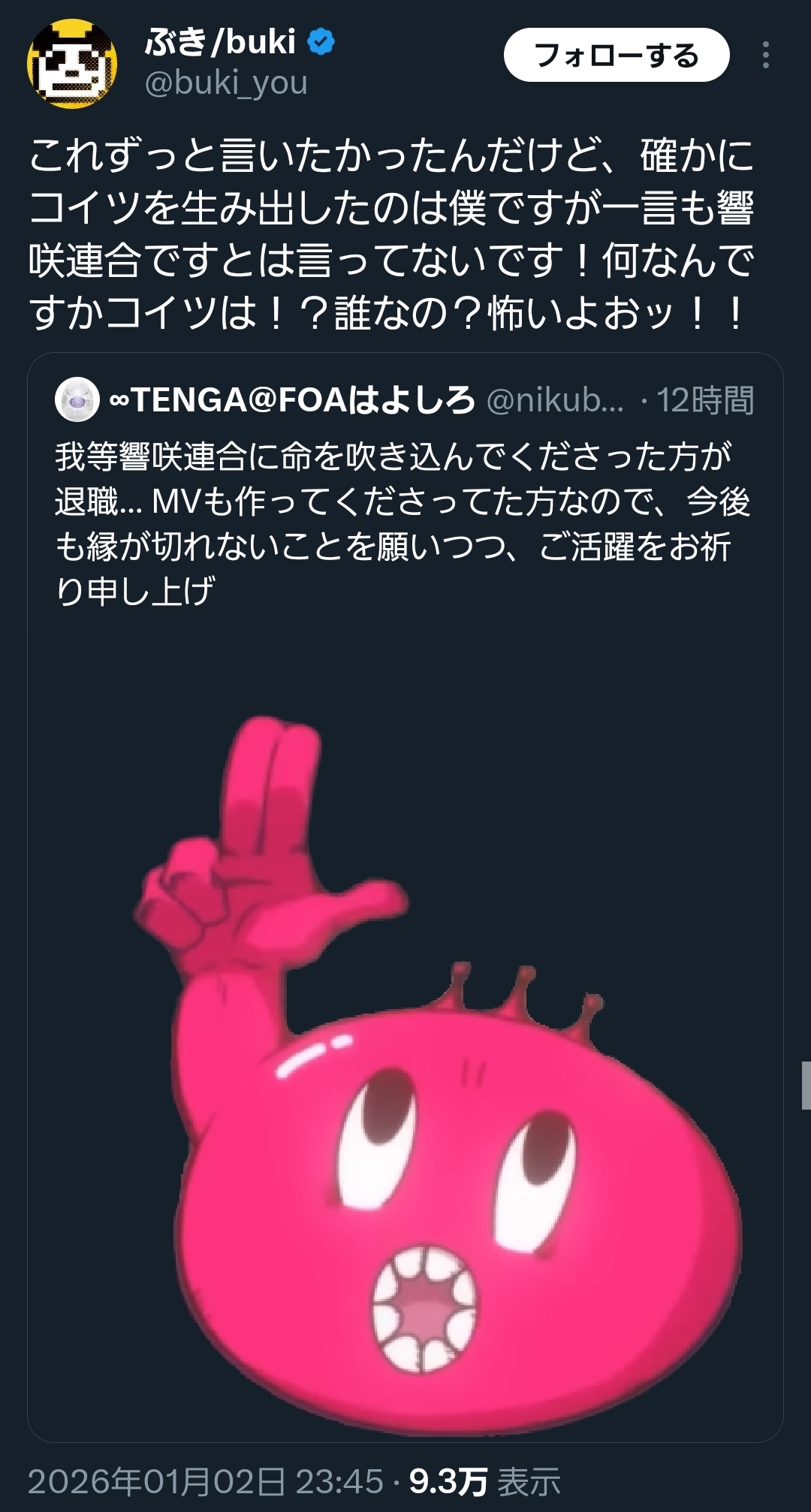 | … | 38無題Name名無し 26/01/03(土)08:57:58 IP:126.194.*(openmobile.ne.jp)No.11306951そうだねx1朝起きて配信みたらミオしゃが出てた |