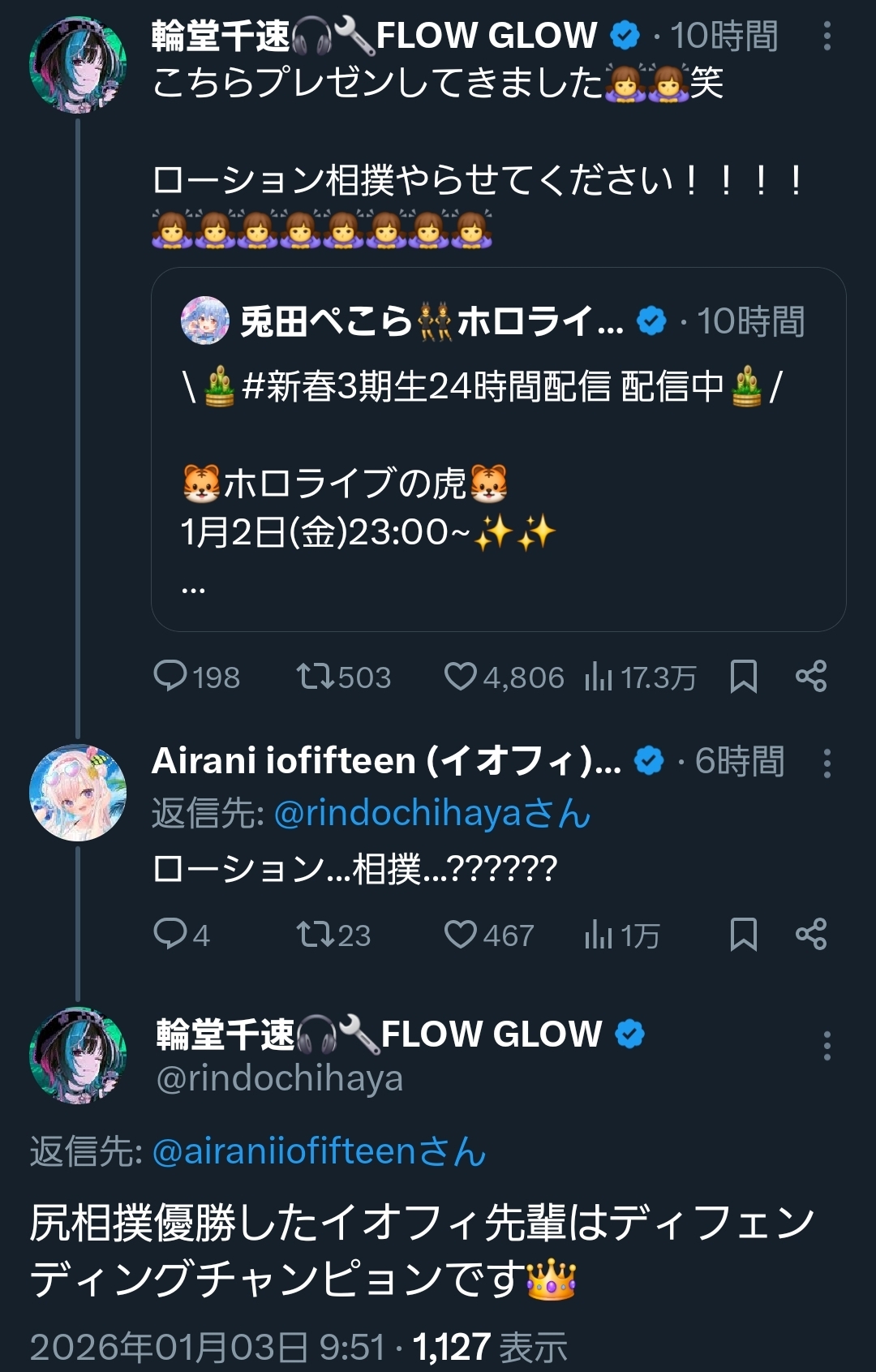 | … | 983無題Name名無し 26/01/03(土)10:24:55 IP:222.9.*(commufa.jp)No.11307915+スバル団長の射精みました |