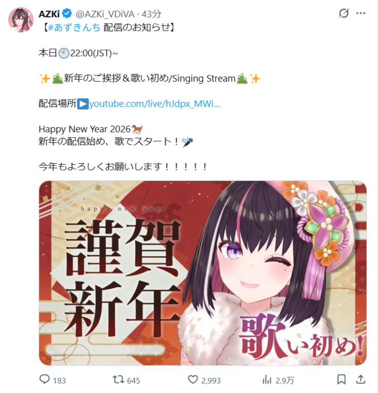 | … | 985無題Name名無し 26/01/04(日)17:07:25 IP:220.144.*(mesh.ad.jp)No.11321252そうだねx1 1767514045021.png-(512383 B) あずきち新年歌枠 |