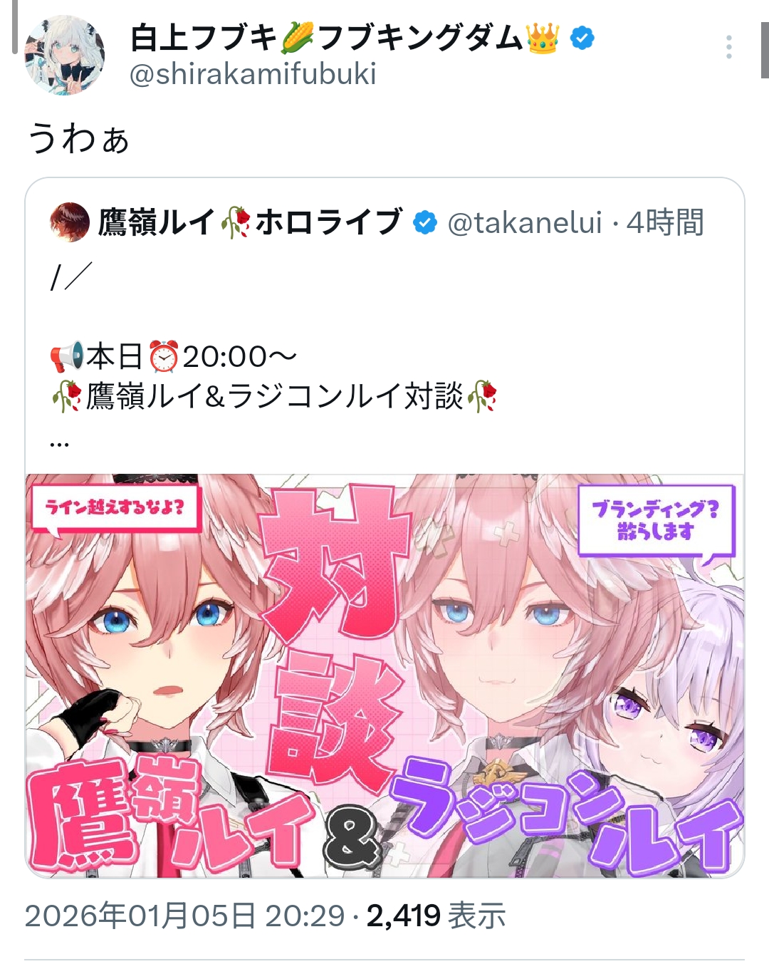 | … | 51無題Name名無し 26/01/05(月)19:25:02 IP:60.87.*(ipv4)No.11329718+リオナの花を見る白上 |