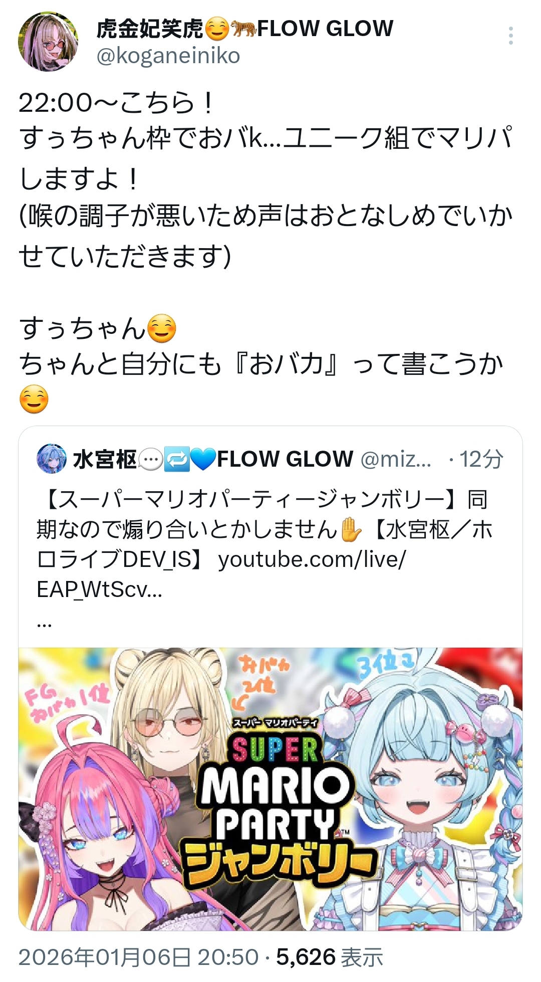 | … | 92無題Name名無し 26/01/06(火)20:43:13 IP:219.104.*(nuro.jp)No.11336115+>何が何でも地獄企画を復活させようとするすいちゃんVS何が何でもその地獄にすいせいも巻き込もうとするスバル |