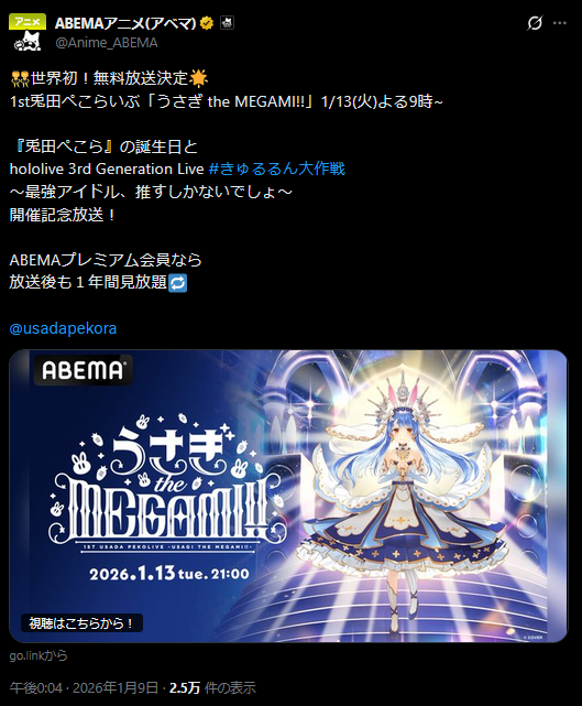 | … | 1000無題Name名無し 26/01/09(金)19:19:56 IP:114.161.*(ocn.ne.jp)No.11349249+にこたん歌謡ショー最高だな・・・ |