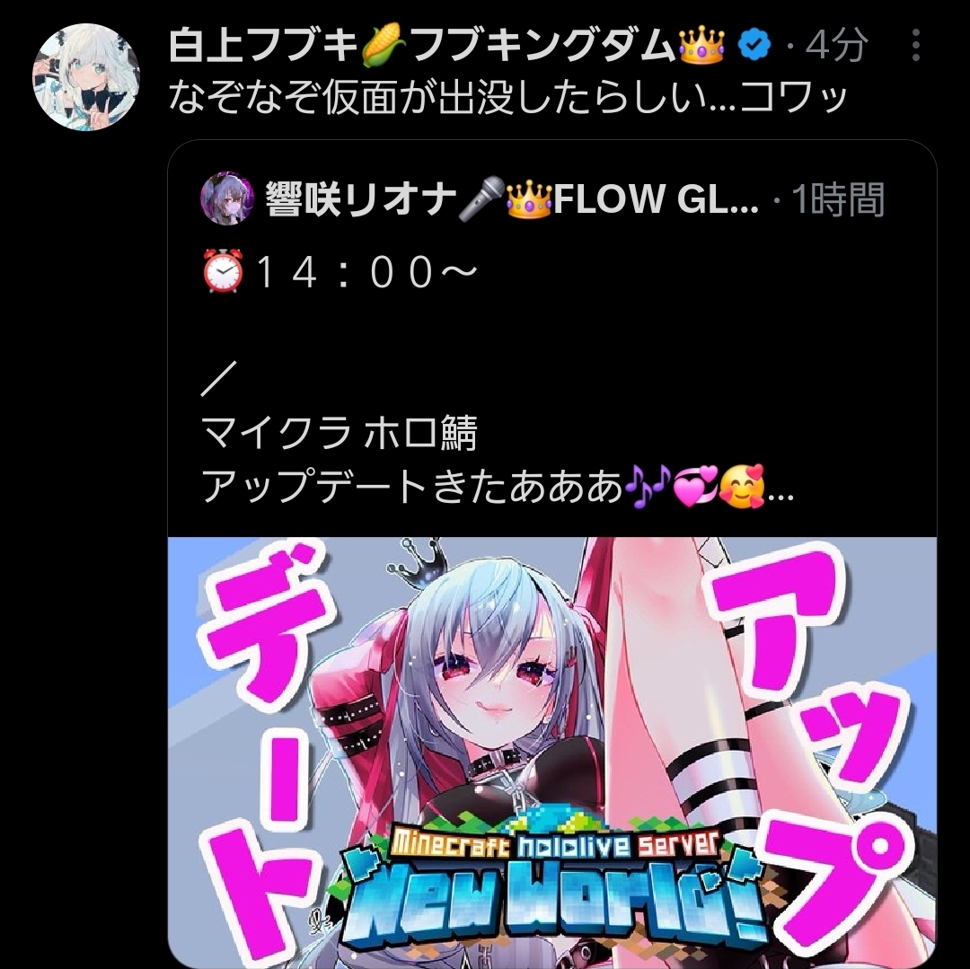 | … | 998無題Name名無し 26/01/09(金)19:19:05 IP:36.13.*(dion.ne.jp)No.11349244+こよりのべちょべちょの脇汗…コヨリニウム豊富そうだな |