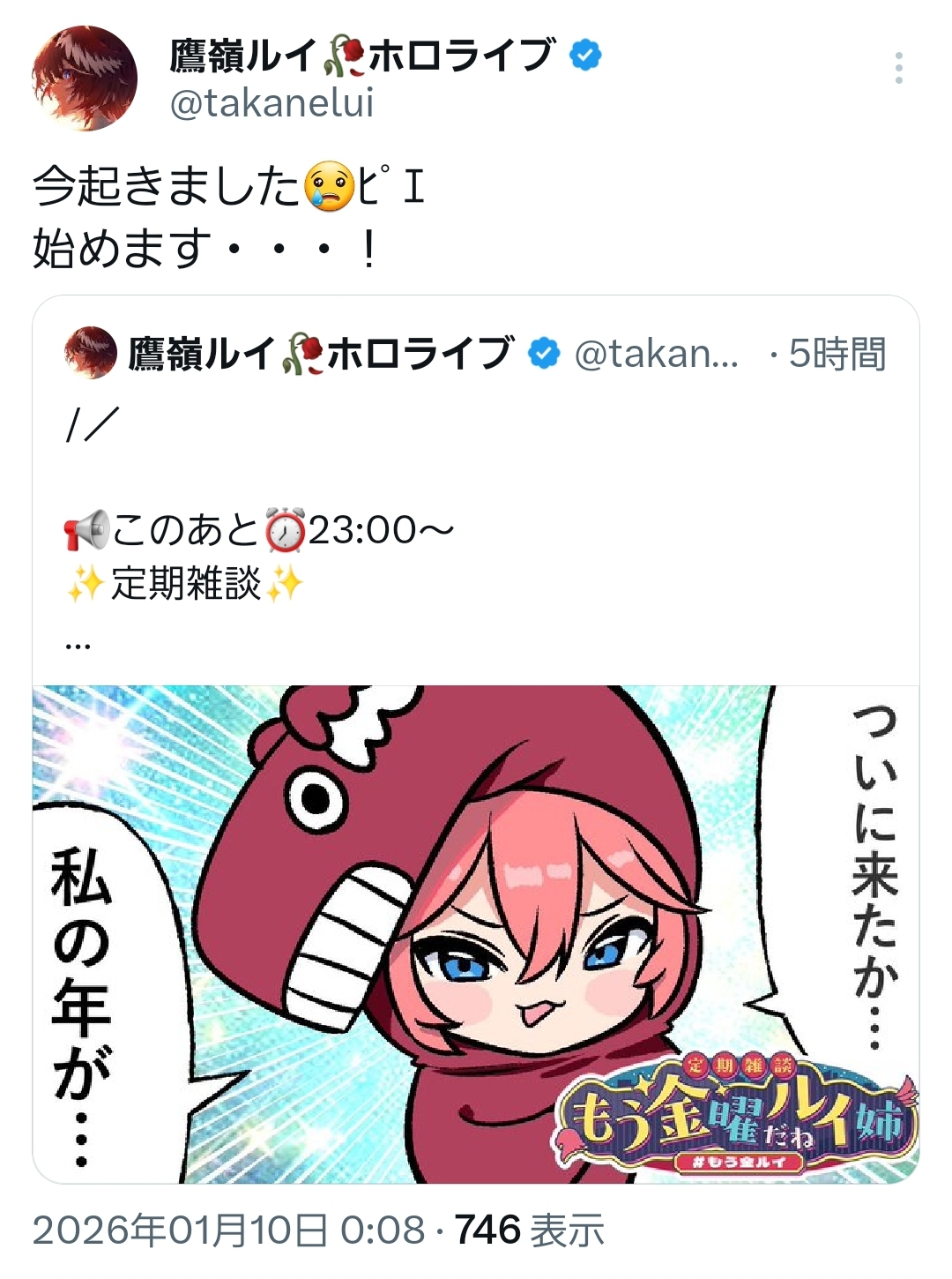 | … | 917無題Name名無し 26/01/10(土)00:09:36 IP:49.129.*(mesh.ad.jp)No.11352246そうだねx6 1767971376293.jpg-(575060 B) ルイ姉起床 |