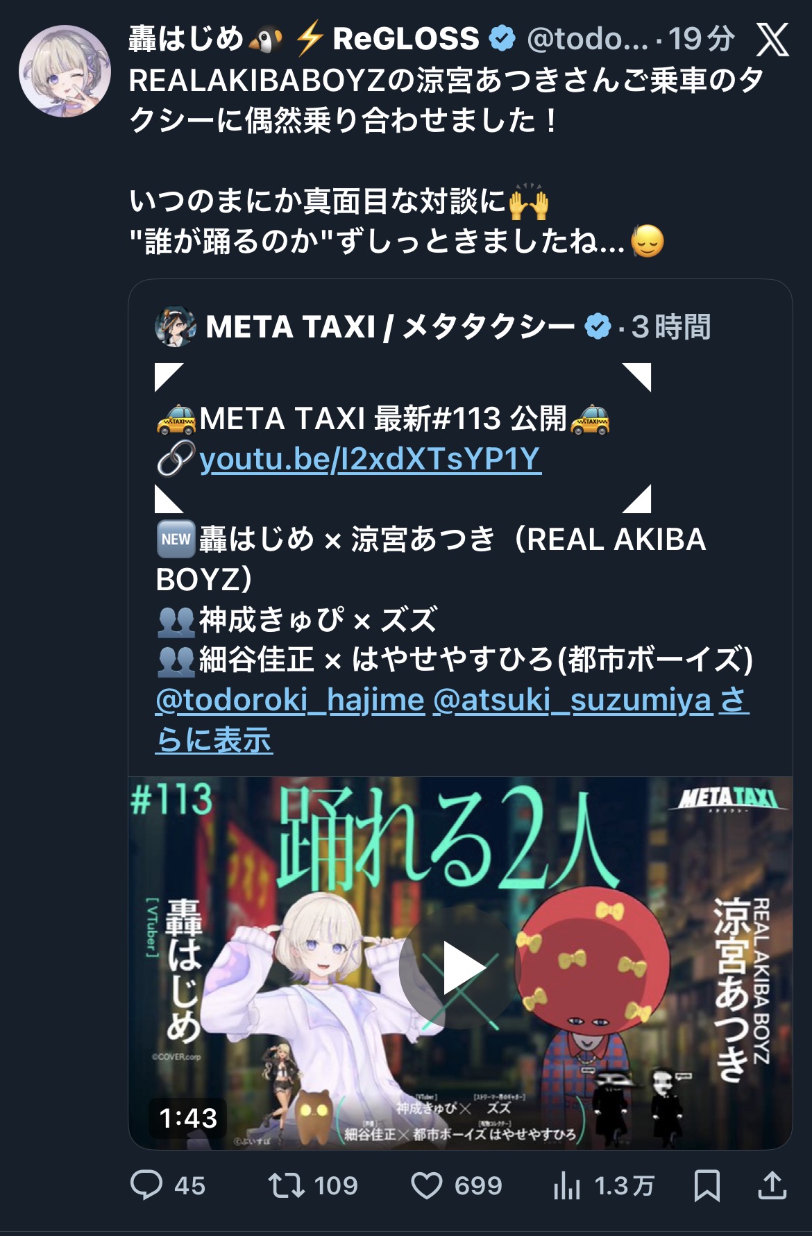 | … | 63無題Name名無し 26/01/09(金)22:52:02 IP:211.7.*(ipv4)No.11351380+スバルの同時視聴枠の時間はいつもimgかmayのアニメ実況スレみたいになっとるな… |